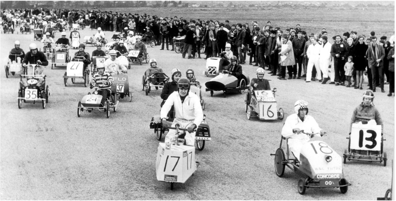 8. The Pedal Car Race was a popular part of RAG week during the 60s, and this particular photo shows the 24-hour Pedal Car Race of 1967, modelled on the Le Mans 24-hour race, except with little pedal cars instead. Over 500 of the participants and spectators ended up in various Bristol hospitals afterwards, complaining of rashes: conspiracies abounded, naturally, but in the end, it seemed that the cause was only a combination of dust, tar and sunshine.