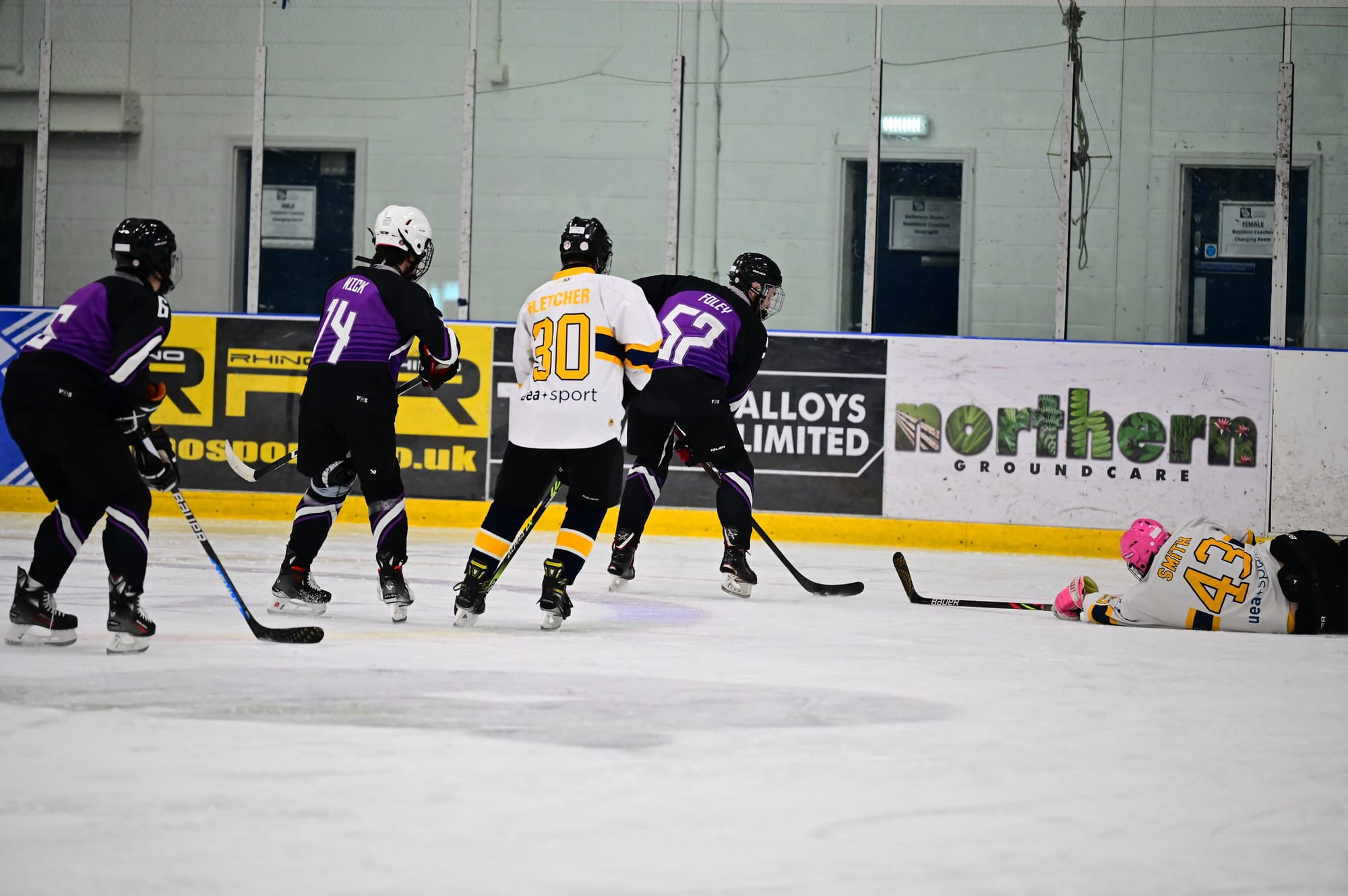 With a four hour break in between the playoff games, Bristol had to keep focus and get some rest – being short-benched for six games was starting to kick in. Winning the group stage ensured entry to the Gold semifinals against Northumbia Kings C, anticipated to be one of the strongest teams. Bristol’s captain #28 Marner registered (perhaps incorrectly…) an assist on Korchinov’s first goal of the game, but the clear highlight of this game was a solid goal from #44 Lord, a brand-new skater for Bristol who had only ever attended one ice hockey training! Korchinov ended with yet another game winning goal to unfortunately knock out the Kings with a 3-0 win.