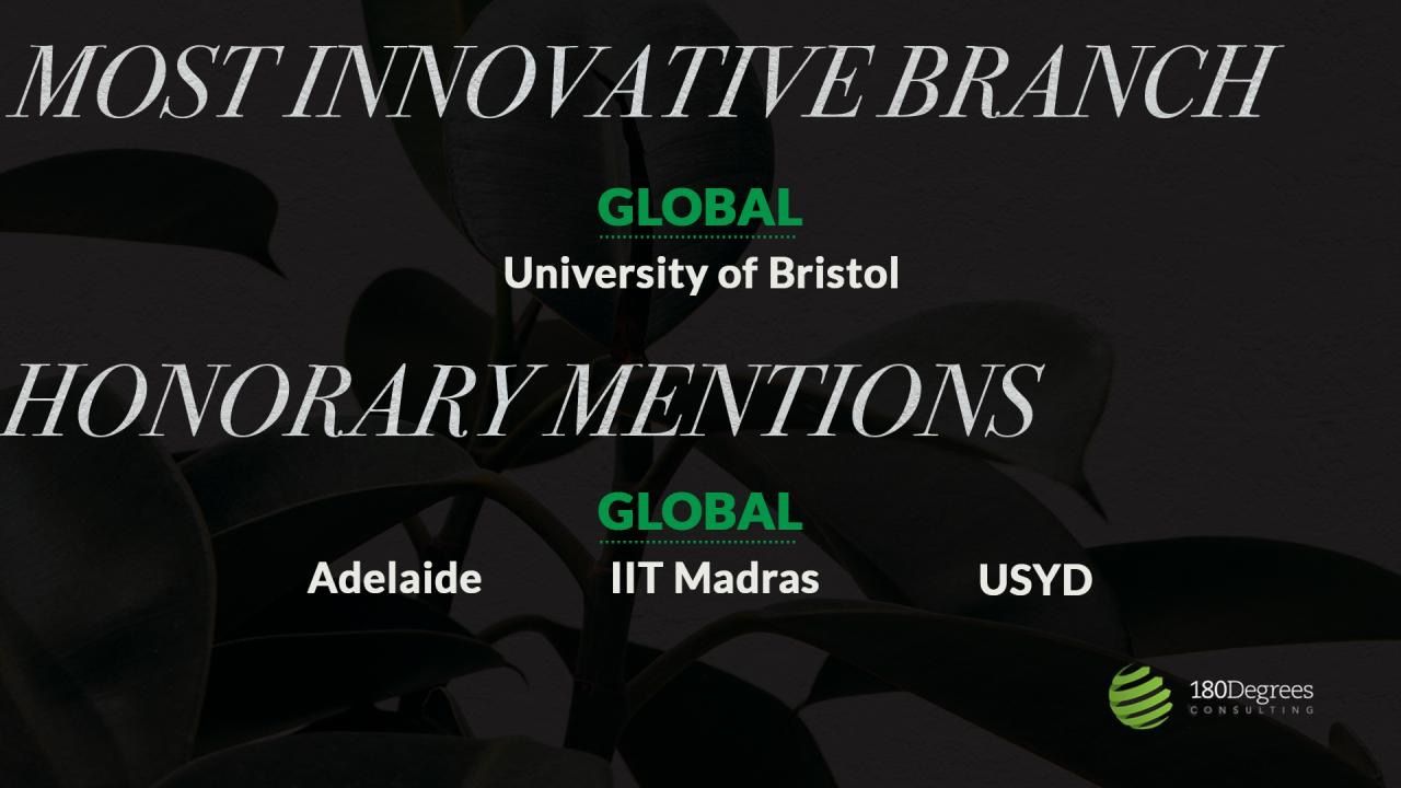 180 Degrees is the world's biggest volunteer consultancy, with activities in more than 35 countries and 165 branches. Bristol's division stands out for it’s excellence, having recently been awarded ‘Most Innovative Branch Worldwide' at the 180 Degrees Consulting global branch awards 2020.