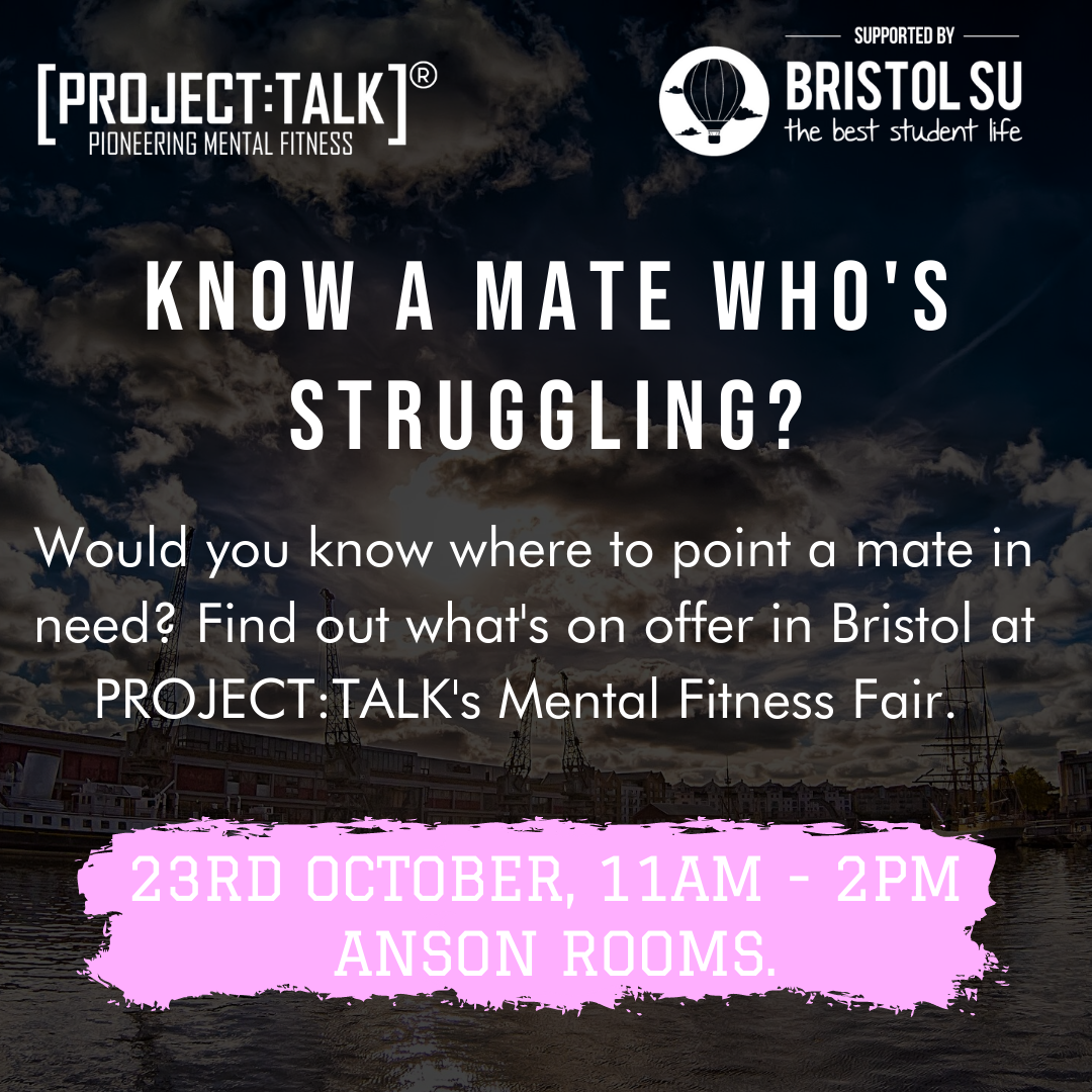Today, Bristol SU, in collaboration with PROJECT:TALK, is launching their Mental Fitness Fair in the Anson Rooms, located in the Richmond Building, to help signpost mental health services from PROJECT:TALK, the University and within the Bristol community.