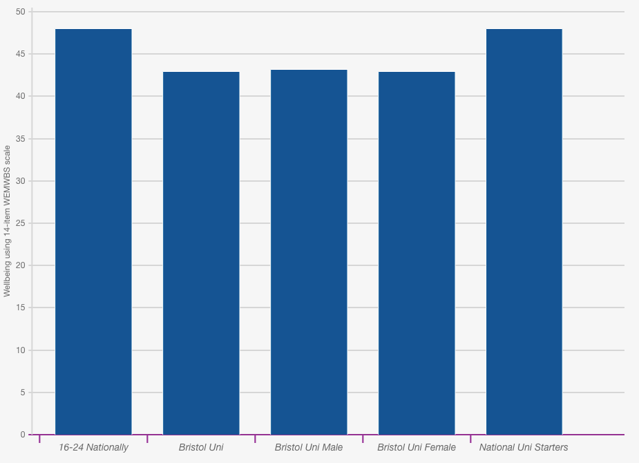 Higher scores on the WEMWBS scale indicate better mental health. The average score for UK 16-24 year olds are between 48 -50. The average score for Bristol students is 43.
