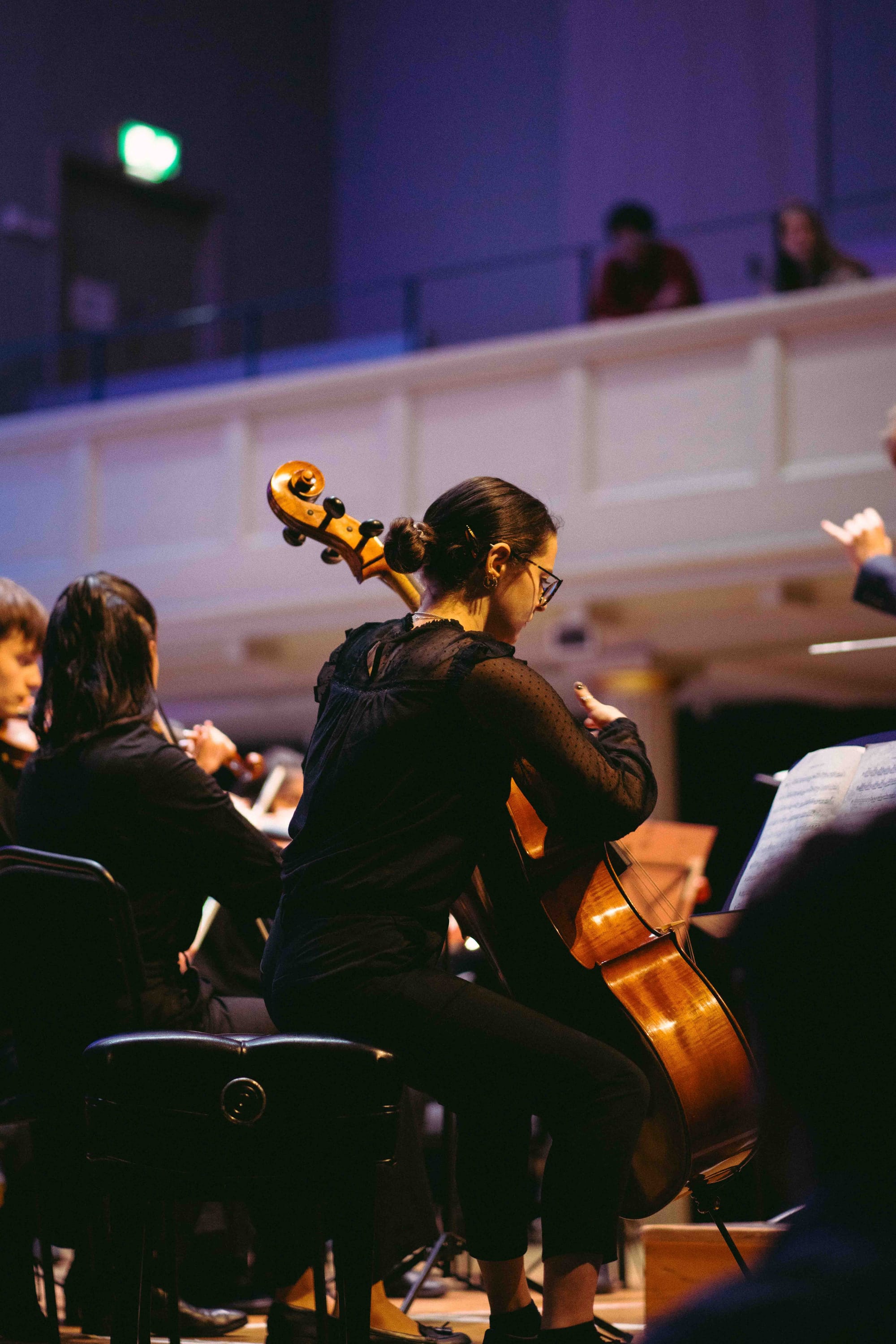 A personal highlight of the evening, the night continued with Saint-Saen’s ‘Cello Concerto No. 1 in A minor (Op. 33)’, performed by final year music student and winner of the BUMS ConcertoCompetition 23/24, Libby Hamilton. Awarded the Thomas Beecham prize for her first-year recital, Libby is principal cellist for the University Symphony Orchestra, playing also with the Chamber Orchestra, Baroque Ensemble and Symphonia. Unfaltering in her performance of the hugely demanding concerto, Libby’smusicianship was a joy to watch and greatly applauded by all. Perfectly balanced alongside the orchestra by conductor Sam Kail-Dyke, the convention-breaking concerto was approached with professional ease by both conductor and soloist, making for an exciting and entertaining performance.