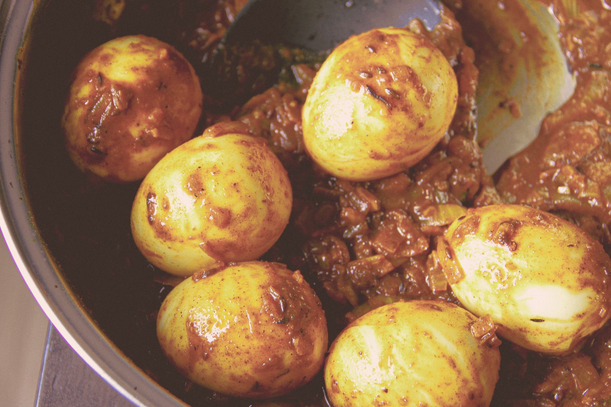 For instance, this dish (pictured below) is called “Deem Bhuna”, which translates to egg curry. It’s a common Bengali household delicacy. However, although most recipes would call to use tomatoes for the curry base along with onions, ginger and garlic, growing up, my family would opt out of using tomatoes at all. We would start with ghee, cumin, cardamom, bay leaves chillies and cinnamon sticks, sauté in the diced onions, garlic and ginger paste and add in powdered spices such as turmeric and chilli powder. We would fry the boiled eggs in a different pan with some ghee, turmeric and salt. We would then add in the eggs to the curry base, pour in some water and allow to simmer until the curry thickens again.
