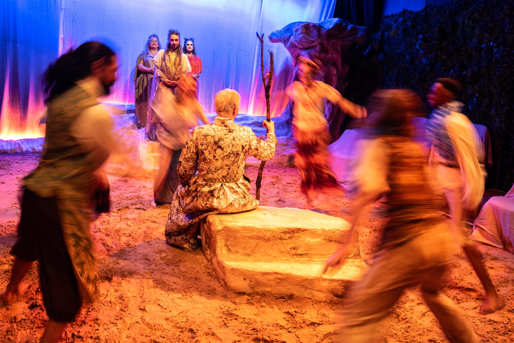 The production’s greatest strengths are its staging, clever set design, and effects. There is a remarkable attention to detail throughout the play undertaken by the production crew. The thrust stage draws the audience into the action, heightened by a constant undercurrent of an ominous soundscape. Tons of real sand lines the floor, as well as wild plants trailing the walls - in one scene transforming into dozens of beady red eyes. The set design creates a tangible sense of isolation, a wild, barren land where traditional hierarchies will be challenged. Once we land on the island, the lighting is rich - sunset tones illuminating the stage against stark beach rocks.