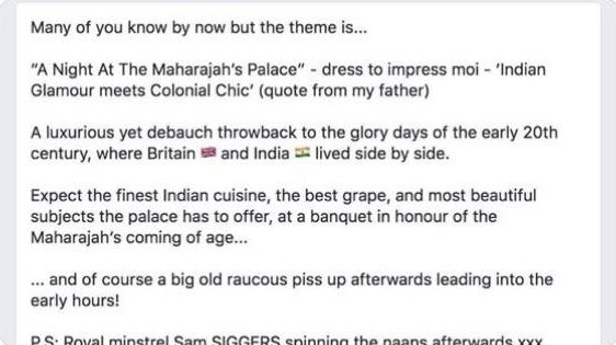 The event on Facebook had the description "A Night at the Maharaja's Palace - dress to impress moi - 'Indian glamour meets colonial chic (quote from my father). A luxurious yet debauch throwback to the glory days of the early twentieth century, where Britain and India lived side by side.