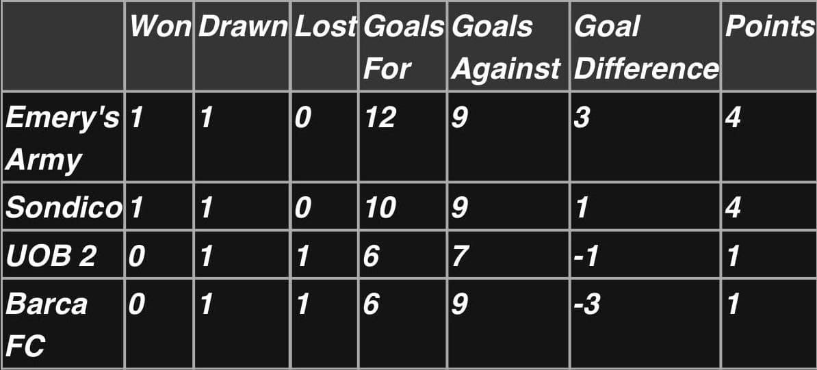 The first round of the tournament was on the 26th October from 18:30-20.00, and it had 4 teams taking part: Emery's Army, Sonic, UOB 2 and Barca FC. They all played 2 matches each with Emery's Army at the top of the table with 4 points, and a +3 goal difference creating distance between them and second placed Sondico. I wasn't present at this first round, however Joe Leaver said that the tournament had been successful and was looking forward to the second round.
