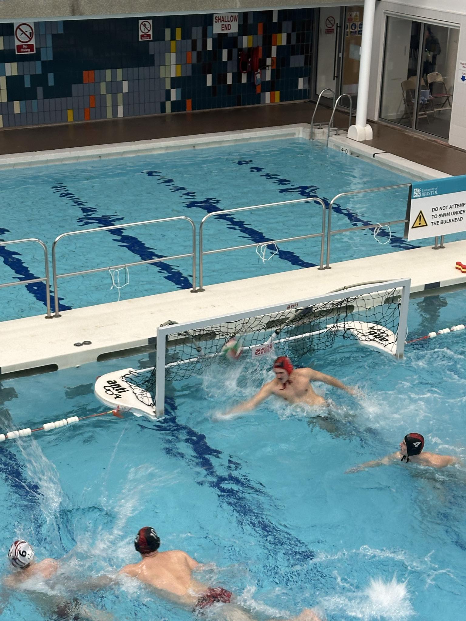 To complicate matters further, Bristol conceded a quick goal from the restart and at the same time both a UWE and (another!) Bristol player were red carded for a tussle in the pit. Bristol were now 3 goals down with 7 and a half minutes to go. Luckily for Bristol, Callum Mckenzie was able to produce a moment of personal brilliance as he spun his man and lobbed the keeper to reinvigorate the team. Another hero in the clutch was the fresher goalkeeper Zac Downer. He made a huge double save from close range to keep UWE out and Bristol hopes alive. 3 minutes of evenly matched, passionate water polo then passed with neither team able to find the net until a UWE player was sent out for 30 seconds. Bristol used the extra man to whizz the ball around the arc and find Hannibal Nabli Lopez whose shot beat the goalkeeper to the near post.