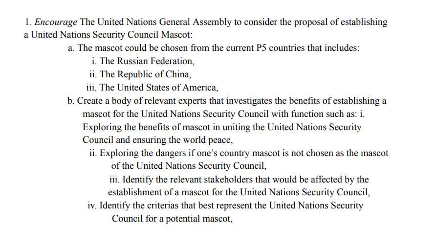 India urges the necessity for a UN mascot, claiming it to be a symbol of unification that allows a fight for peace without division. In desperation the delegate points to a cuddly toy mascot to convince the committee of its necessity.