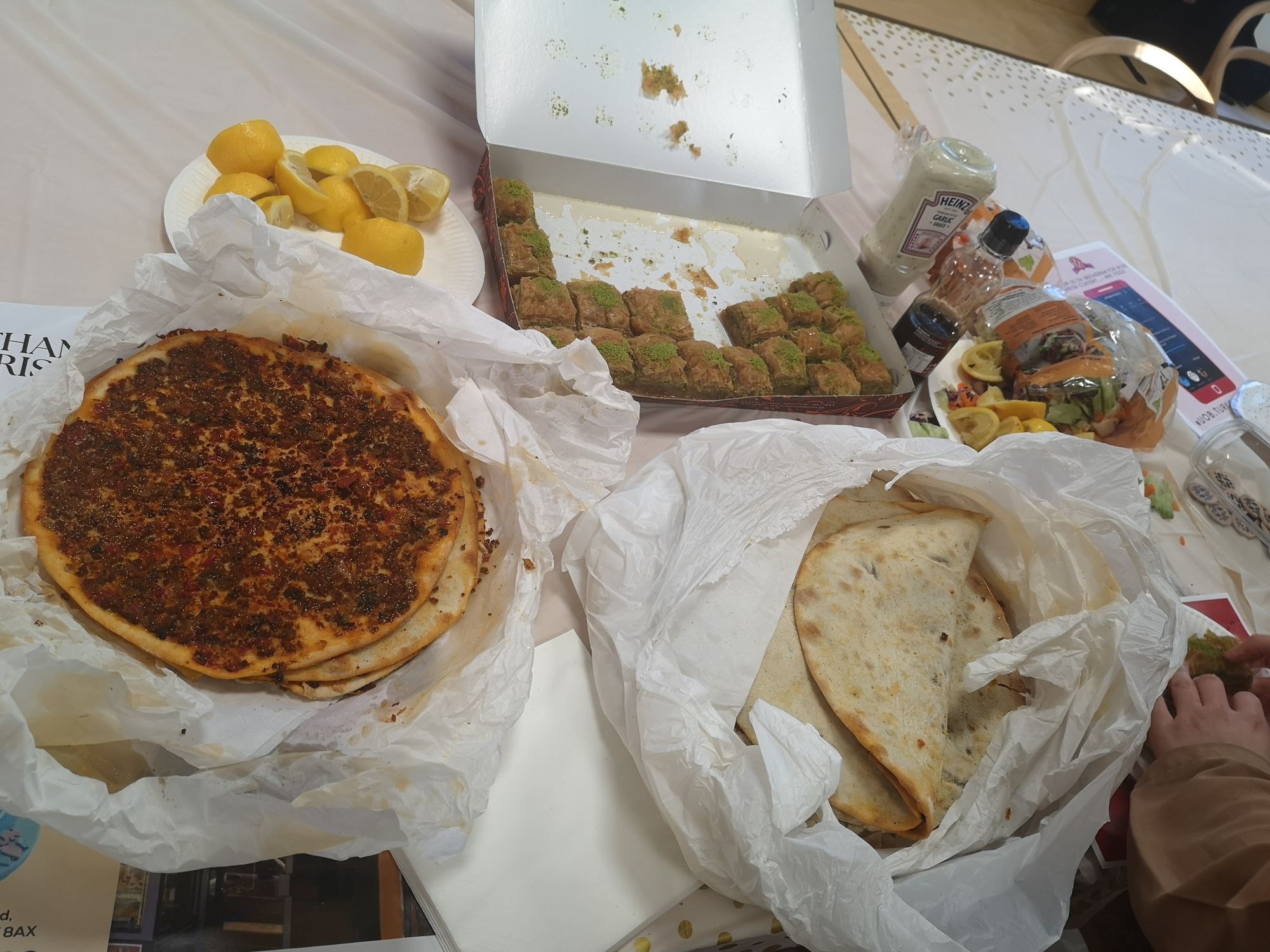 One stall featured freshly fried samosas and kebabs from Pakistan, while another offered crispy spring rolls from Indonesia. The Emirati stall had a range of hummus, falafel, doughnuts and Arabic coffee, while the Turkish stall offered flatbread and baklava.