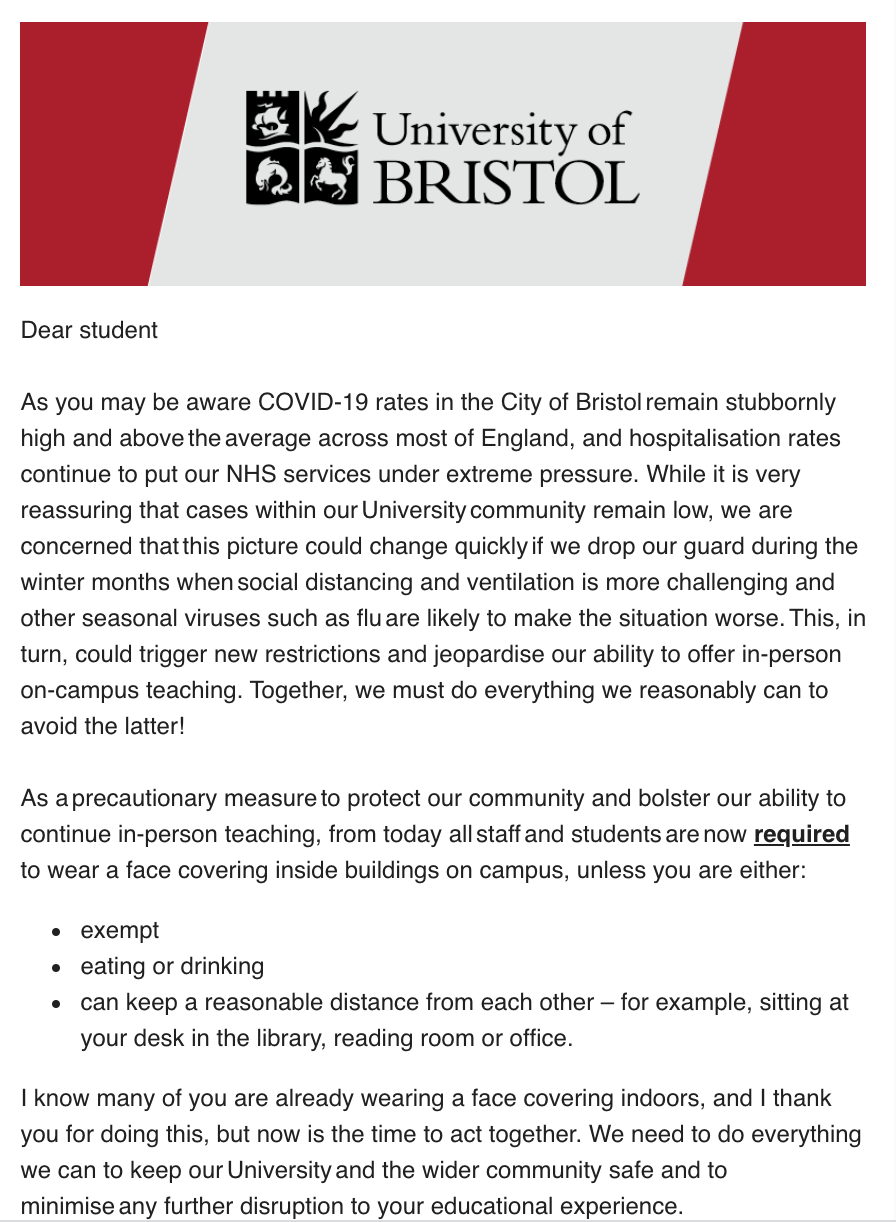 The VC cited the high COVID-19 rates in Bristol and the potential challenges of the winter months, such as ventilation and social distancing, as reasons to bring back the use of face coverings. The email states that factors could threaten the ‘ability to offer in-person on-campus teaching.’