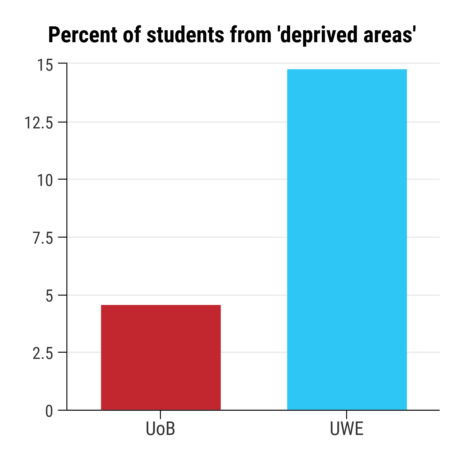 The University of West England’s student body also contains more individuals from ‘deprived areas’, with 14.8 per cent, more than triple the number at the University of Bristol.