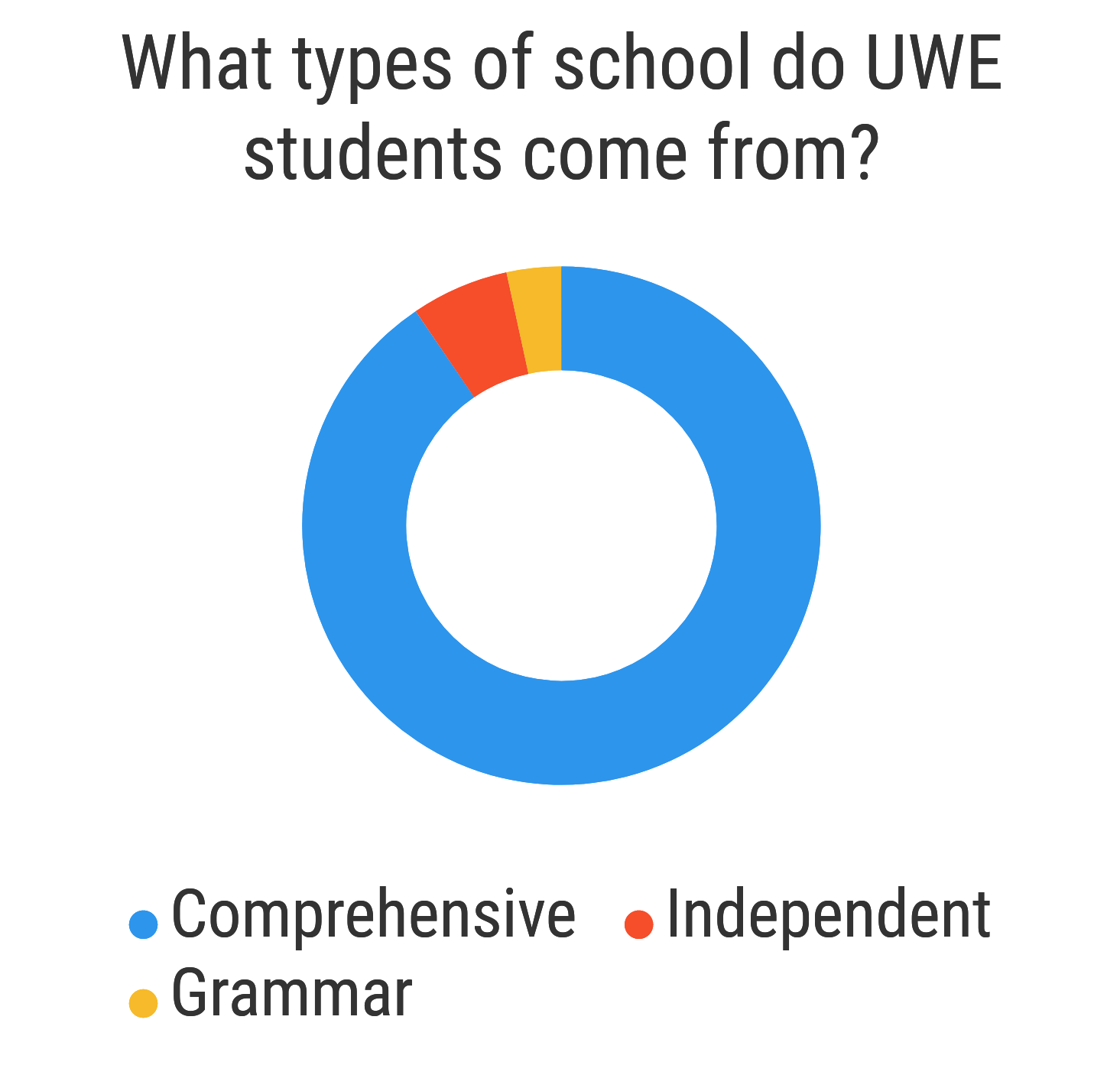 Of UWE’s 28,789 students, just six-point-one percent attended private schools. The vast majority of students at UWE are from comprehensive schools, totalling 90.6 per cent. A further three-point-four per cent are from grammar schools.
