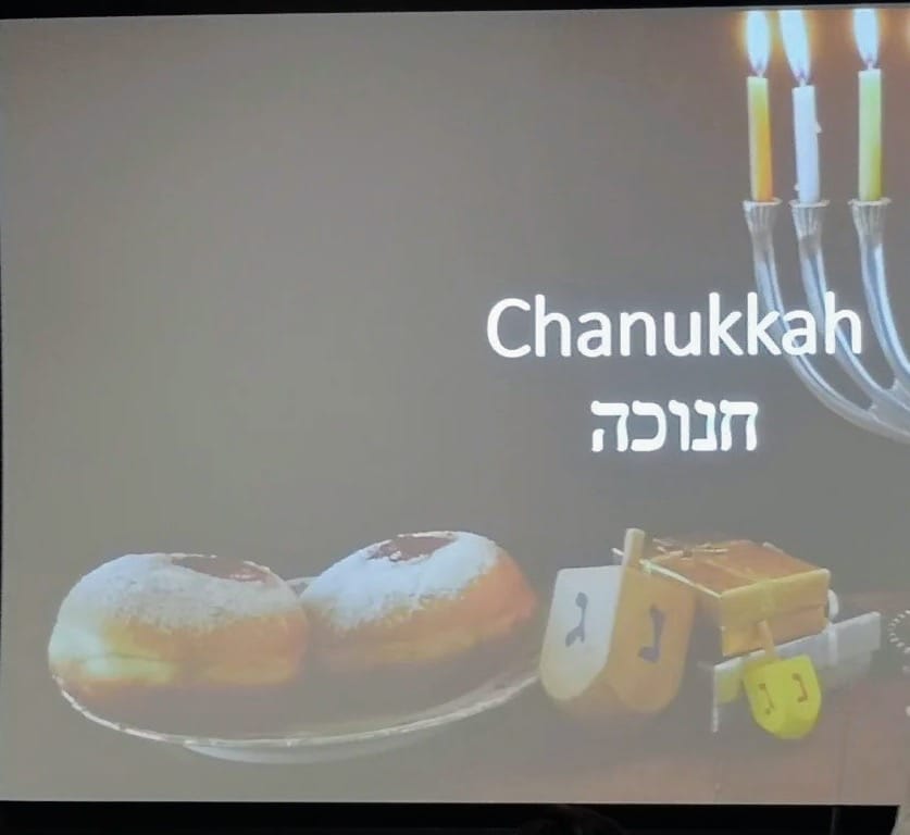 The communal celebration was fuelled by an array of festive favourites, such as bagels, wraps, jam doughnuts and potato latkes. The latter has a symbolic importance due to its oily texture, a reference to the Miracle of Hanukkah.