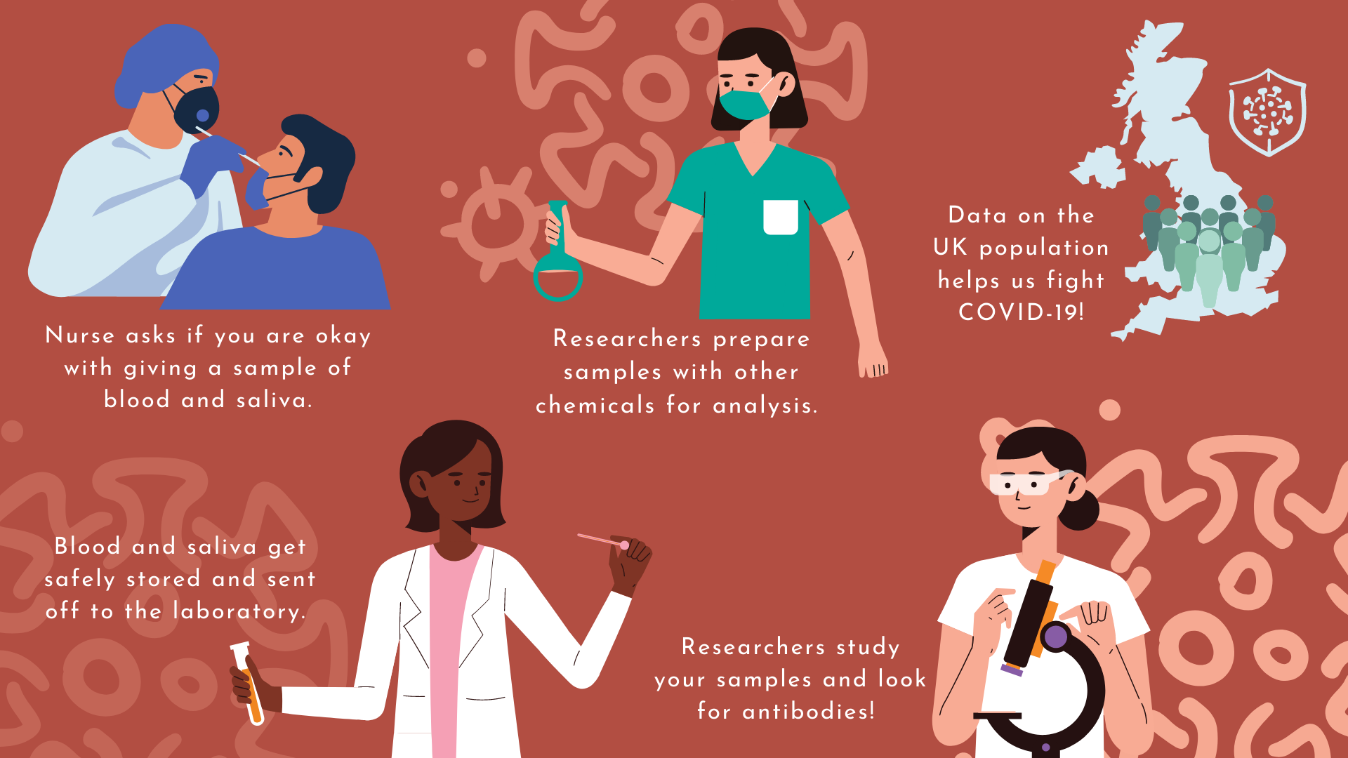 Your samples will be coded, so that your identity remains a secret. Then it will be sent to a laboratory, where scientists will look for antibodies. Antibodies are little proteins in your body that act as a defence in your immune system. When a dangerous disease enters your body, it is your antibodies that attack it, in order to protect you from any harm!