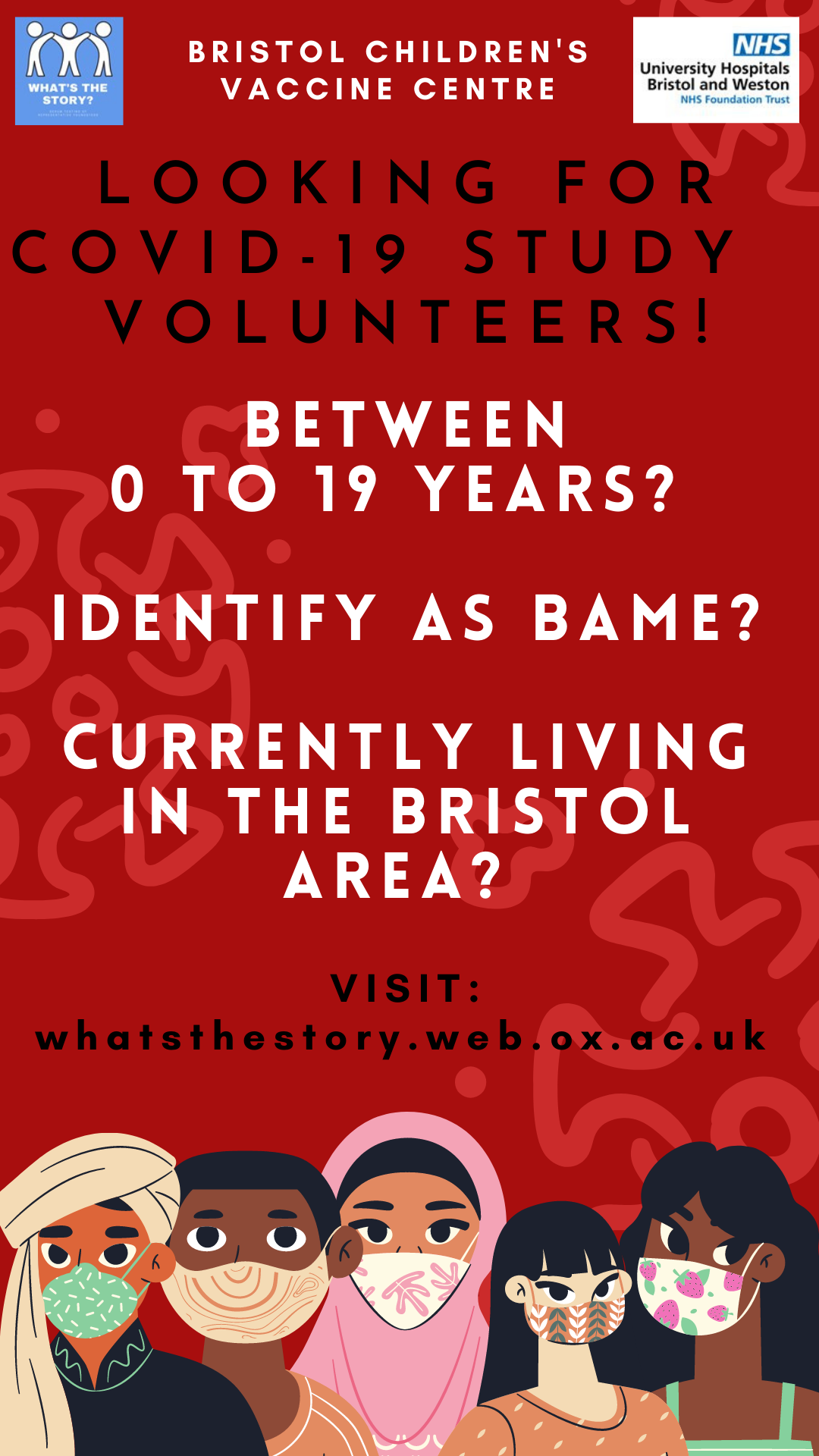 The study team is especially keen to hear from people from Black, Asian and minority ethnic groups aged 0 to 19 from any Bristol postcode, as well as children aged from birth to five years from any ethnicity from postcodes: BS2, BS3, BS8, BS20, BS37, BS41.