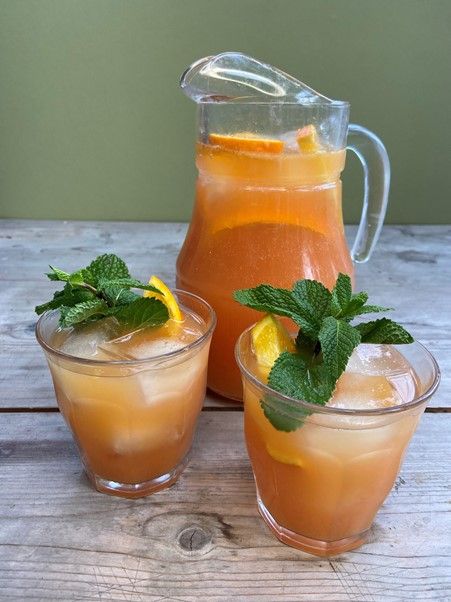 2. To serve, fill short, tumbler-style glasses with a few ice cubes, pour over a healthy glug of punch, and garnish with a slice of orange and a sprig of mint.