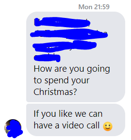 As I was thinking about how I would deal with this, a friend messaged me on Facebook offering to video call me during the Christmas break. Immediately I got inspired – I not only said that I would video call her, but also asked other friends if I could call them over Christmas too. Fortunately, most of them said yes!