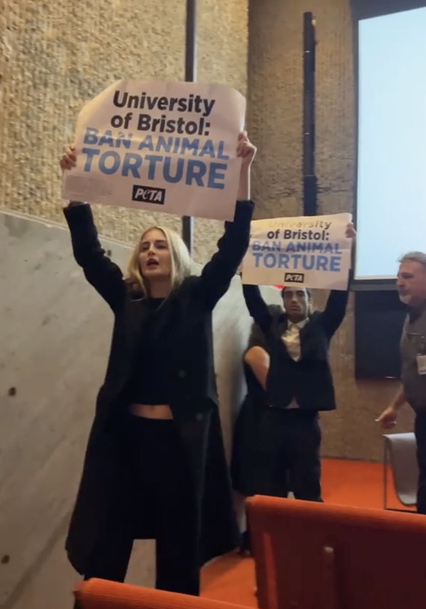 'When I grabbed the mic, it wasn’t just about disrupting a speech - it was about giving a voice to the terrified rats forced to swim in the University of Bristol’s near-drowning tests. PETA and its supporters won’t be silent while cruel experiments continue in the name of so-called mental health research. The university must drop the forced swim test now'.
