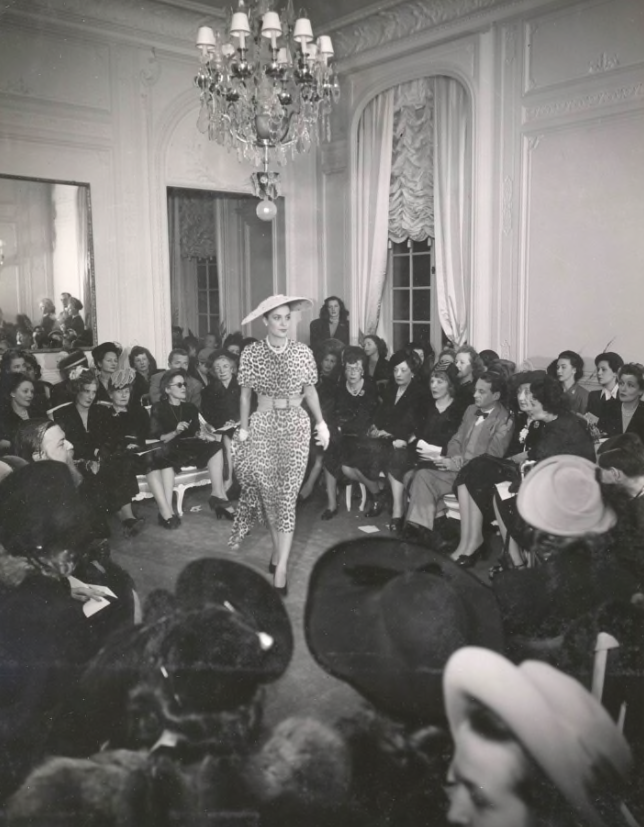 Dior knew that women wanted to feel glamorous again. So in 1946, the House of Dior was established and with its first collection a new era was birthed - The New Look. Very famous, very interesting, worth looking up. Dior’s first collection turned fashion sharply towards youthful and charismatic shapes. It was a visual feast of tiny waists, gentle, undulating shoulders and full skirts. Glamour was back. With coupon-restrictions fading and much more freedom to experiment, leopard print re-entered the arena.