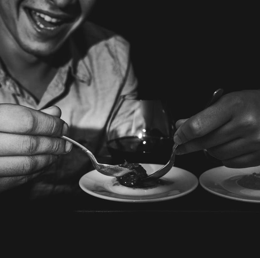 Just as I am getting used to the anxieties of dining in the dark, I realise that I have forgotten one of the most important Gothic traditions: the melodramatic. With a *clang* I register that my plate has been breached. Spoon has met spoon. I imagine a ghost or some gruesome monster reaching through the thick blackness, groping around and now, poised to take a chunk out of my pudding. Inhabiting both the role of ‘damsel in distress’ and the burdened protagonist which characterise much of Gothic literature, I experience intense tremulations of panic and terror. After a tough preliminary battle over my lemon sorbet (which later turns out to be gin-and-tonic flavour), my opponent advances on my chocolate lava cake. With one final blow my lava cake collapses in on itself House-of-Usher-style.