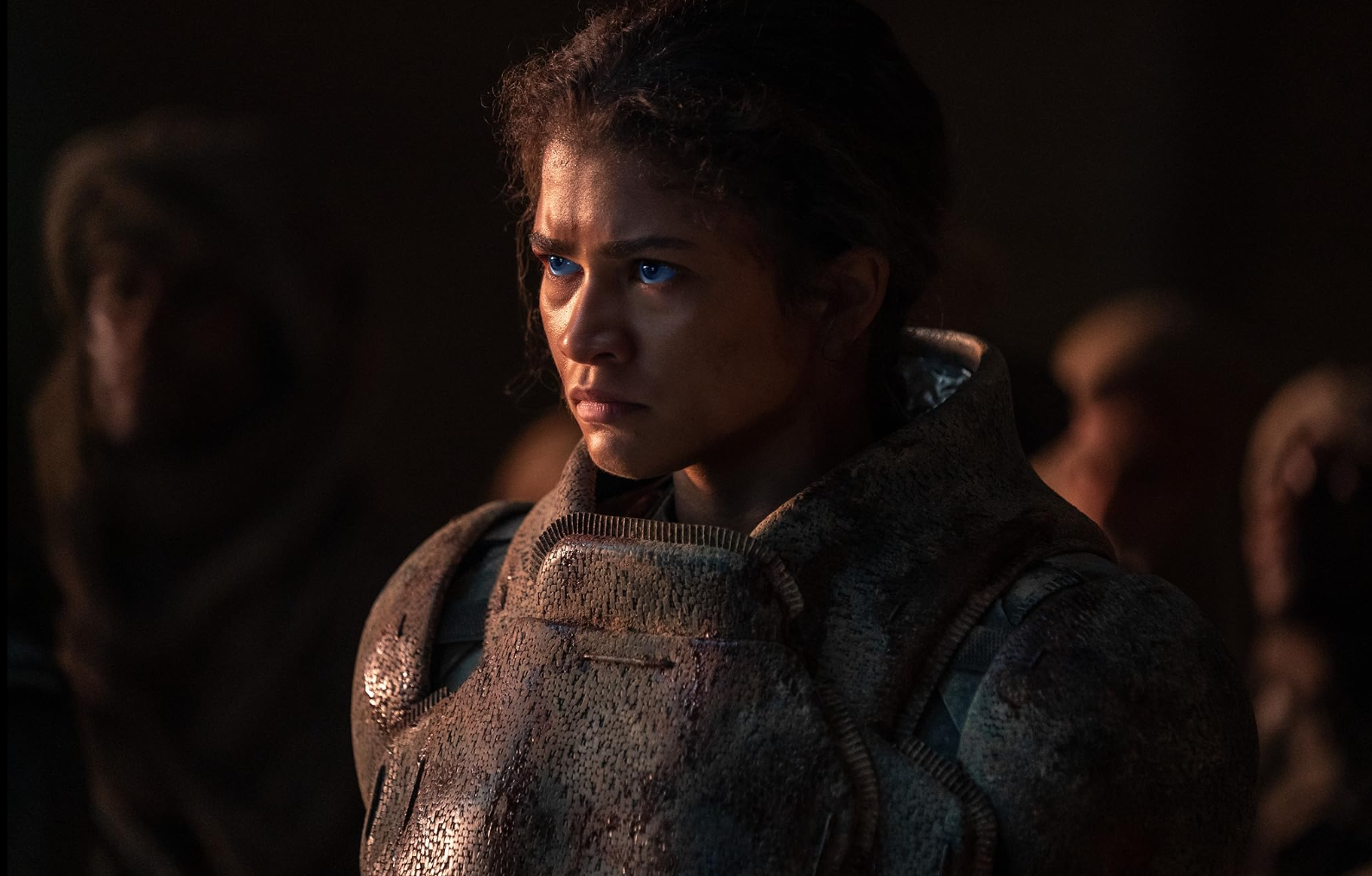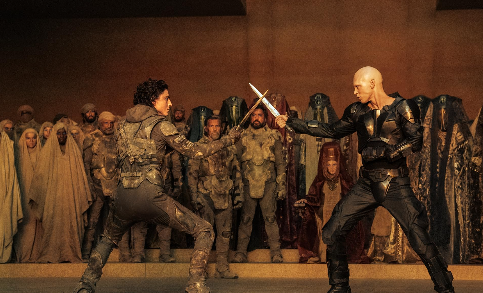 accelerated to the double, compared to that of Part One. Here, Villeneuve divulges from his pensive propensities, displayed evidently in many of the films in his oeuvre; most notably that of 2017’s Blade Runner 2049 and 2016’s Arrival. Nevertheless, unlike other examples of overly ambitious, sci-fi sequels (I am looking directly at you Star Wars: The Rise of Skywalker) this is not to say the pace is suffocating. Another commonality with a Villeneuve picture is the immense, picturesque character of his visual style. With equal admiration accredited to long-time collaborator ‘DP’ Greig Fraser, the cinematography is, yet again, dumfounding. Both Villeneuve and Fraser’s dexterity is fully apparent, proving that there are no better to bear the responsibility of visual actualising the almost incomprehensible images that Herbert’s novels provoke.