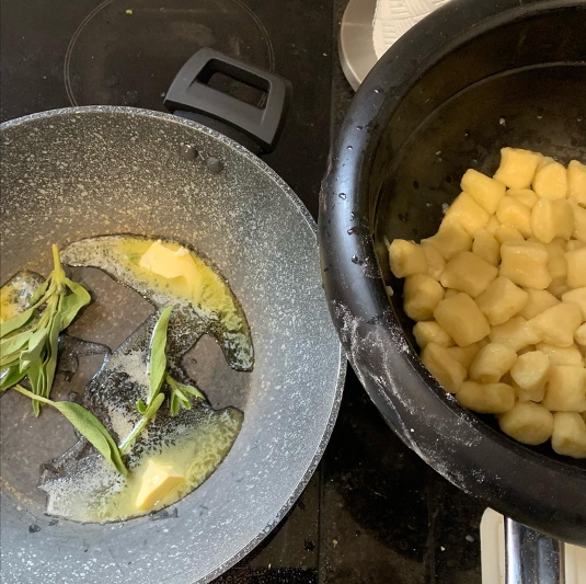 6. While draining the gnocchi, place your butter in a big pan with a few stalks of sage.