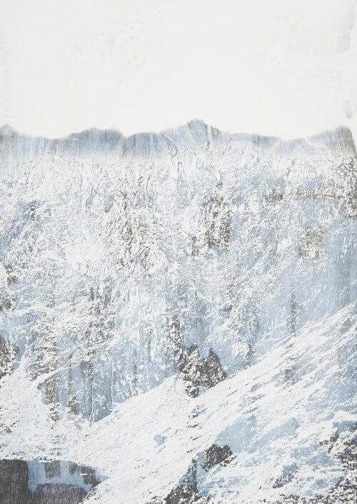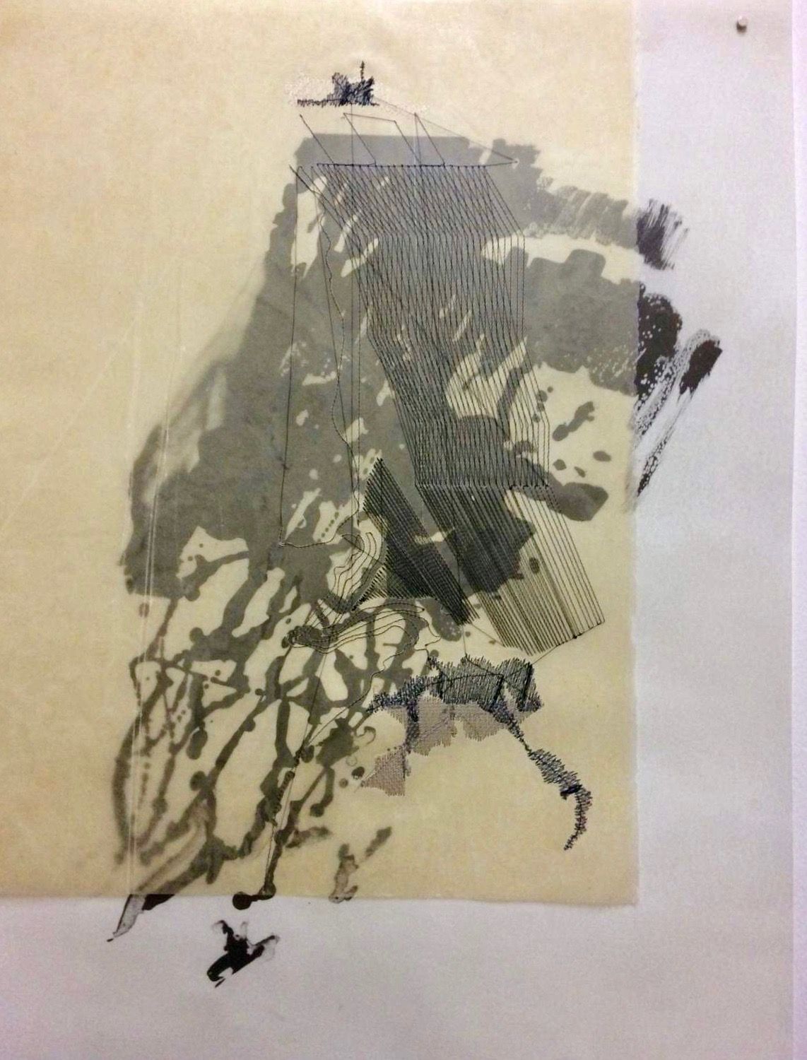 Likewise, Fahy’s highland landscapes and fragmentation of mountains were captivating, reminding me of nineteenth century Japanese woodblock prints. Undeniably one of the most striking pieces in the exhibition was her Lithograph print entitled 'Falling, 2019'. This piece combines print and delicate embroidery on waxed Japanese paper to confront the dichotomies of movement and stillness, alluding to the continuously changing cycles of landscapes. Of this piece, Fahy writes that “what was once the deepest ocean now forms the highest peak”. The exhibition also included a selection of Andy Robinson’s giclee prints. These works contrasted the more delicate prints of Fahy and Chandiramani with their sharp, juxtaposed black and white shapes, providing an immersive, hypnotic and dramatic viewing.