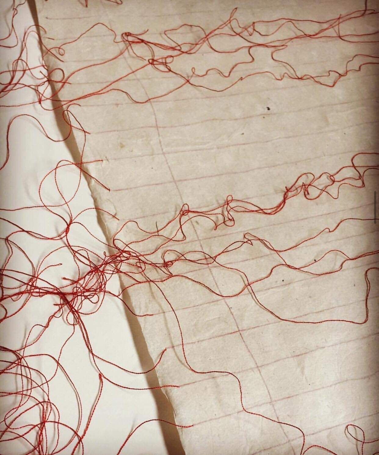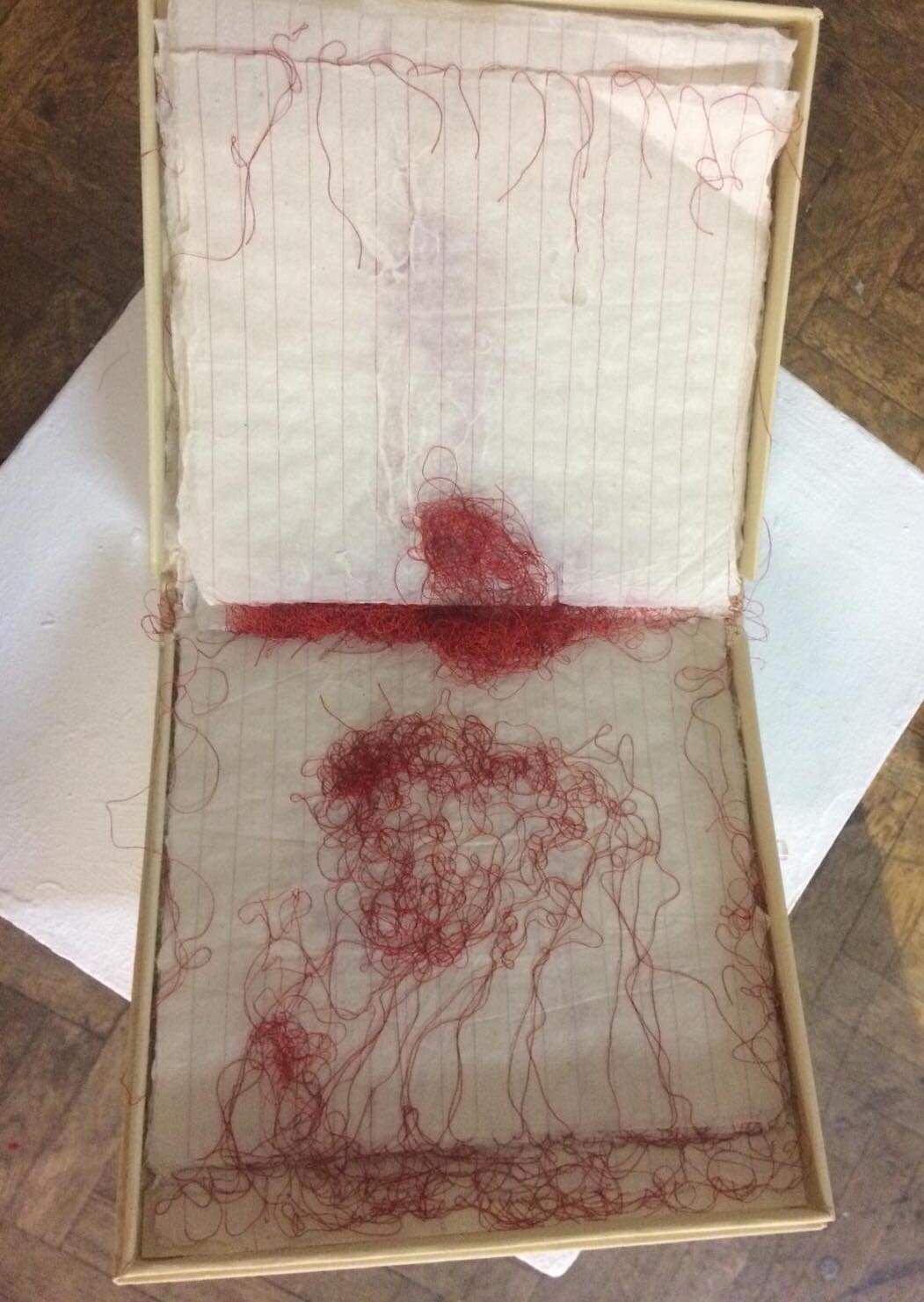 One of the first things you see walking into the exhibition is four small sculptural pieces on plinths in the centre of the room. These sculptures’ emphasis on graphics and shape were effective in tying the works in the exhibition together. Particularly interesting and unique was Prerna Chandiramani’s 'Lines of Communication', which addressed her feelings of loss and grief, again based on her letters from home. This piece was a book of handmade Japanese papers called washi, interwoven with red strings that represent the changing language within her letters. Prerna encouraged us to touch and look through the book, allowing you to fully explore the movement of the threads. I was inspired by the elegance, purity and aesthetic poetry of the sculpture; so delicate yet thought provoking and moving.