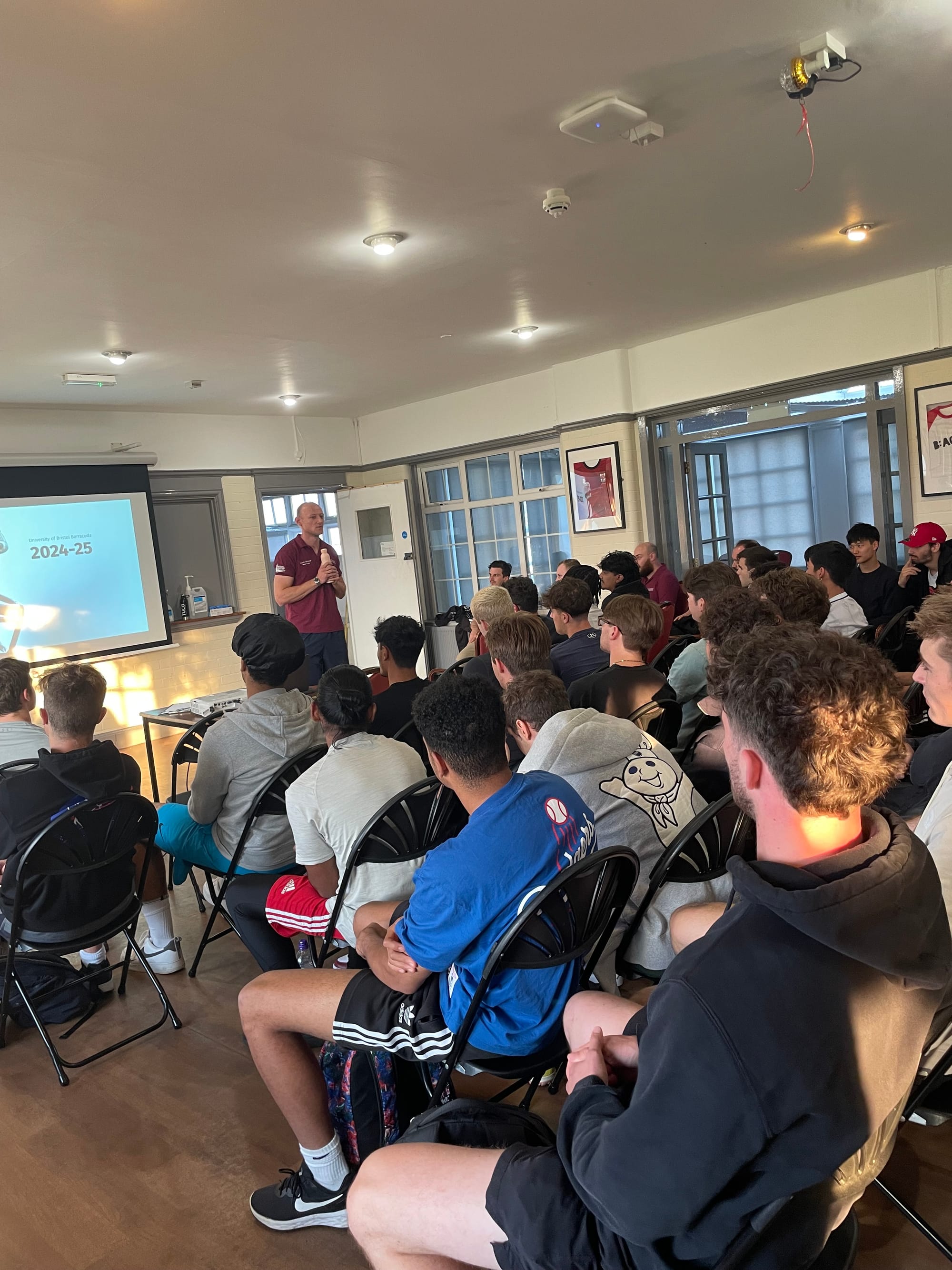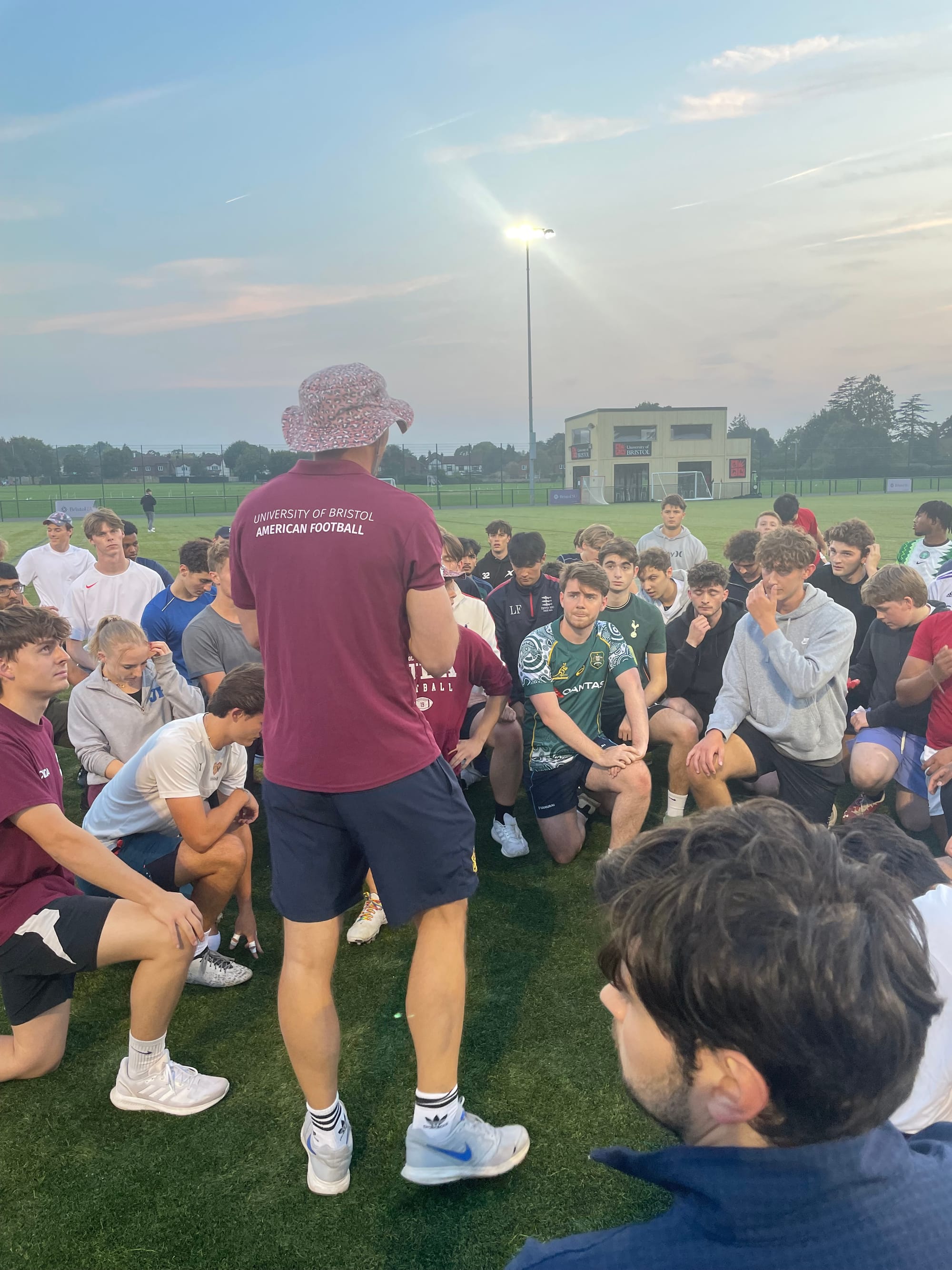We began in the clubhouse, listening to an engaging and determined Head Coach James Gilchrist talk about the winning dynamic and welcoming environment that has been ever-present in the society, even from when Coach Gilchrist was a fellow student and captain several years ago. A whole range of events for the society is present throughout the year: playing in tournaments against other University teams, pub socials, a Friday night lights event, Super Bowl Sunday experience, and their newest creation: Flag Football.