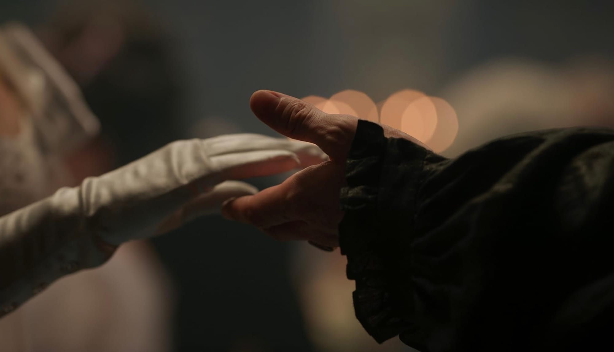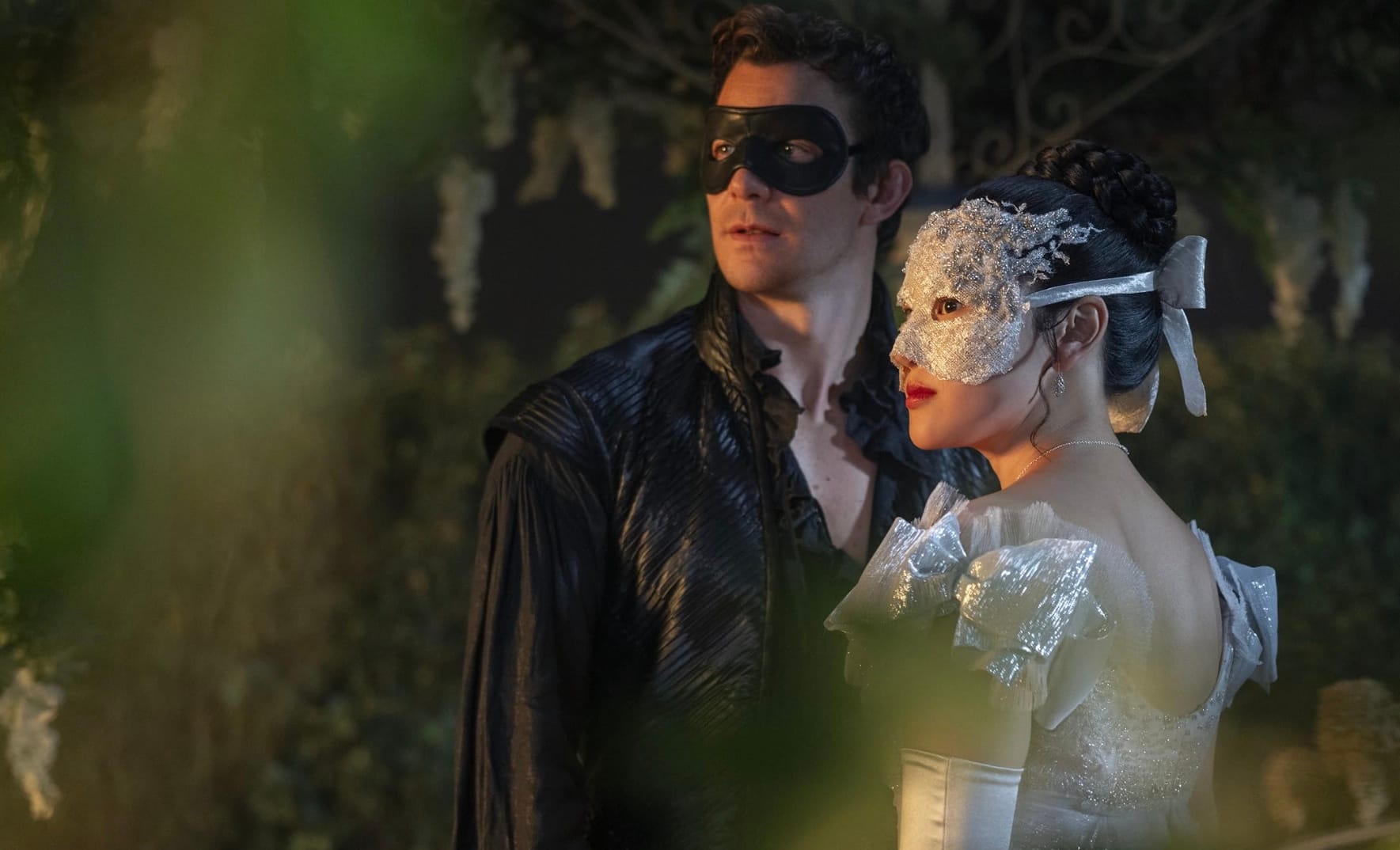 Season four is a Cinderella retelling, starting with a masquerade ball. Our Cinderella, Sophie Baek (Yerin Ha), is a maid adorned in a silver dress and mask and fondly referred to by our leading man, Benedict Bridgerton (Luke Thompson), as the lady in silver. After a quick dance lesson on a private terrace, Benedict removes Sophie's glove to give her a chaste kiss on the hand (unchaperoned!!!!). The clock strikes midnight, and when all guests are supposed to take off their masks and reveal their identities, Sophie runs off into the night, leaving Benedict not with a glass slipper, but with a satin glove.
