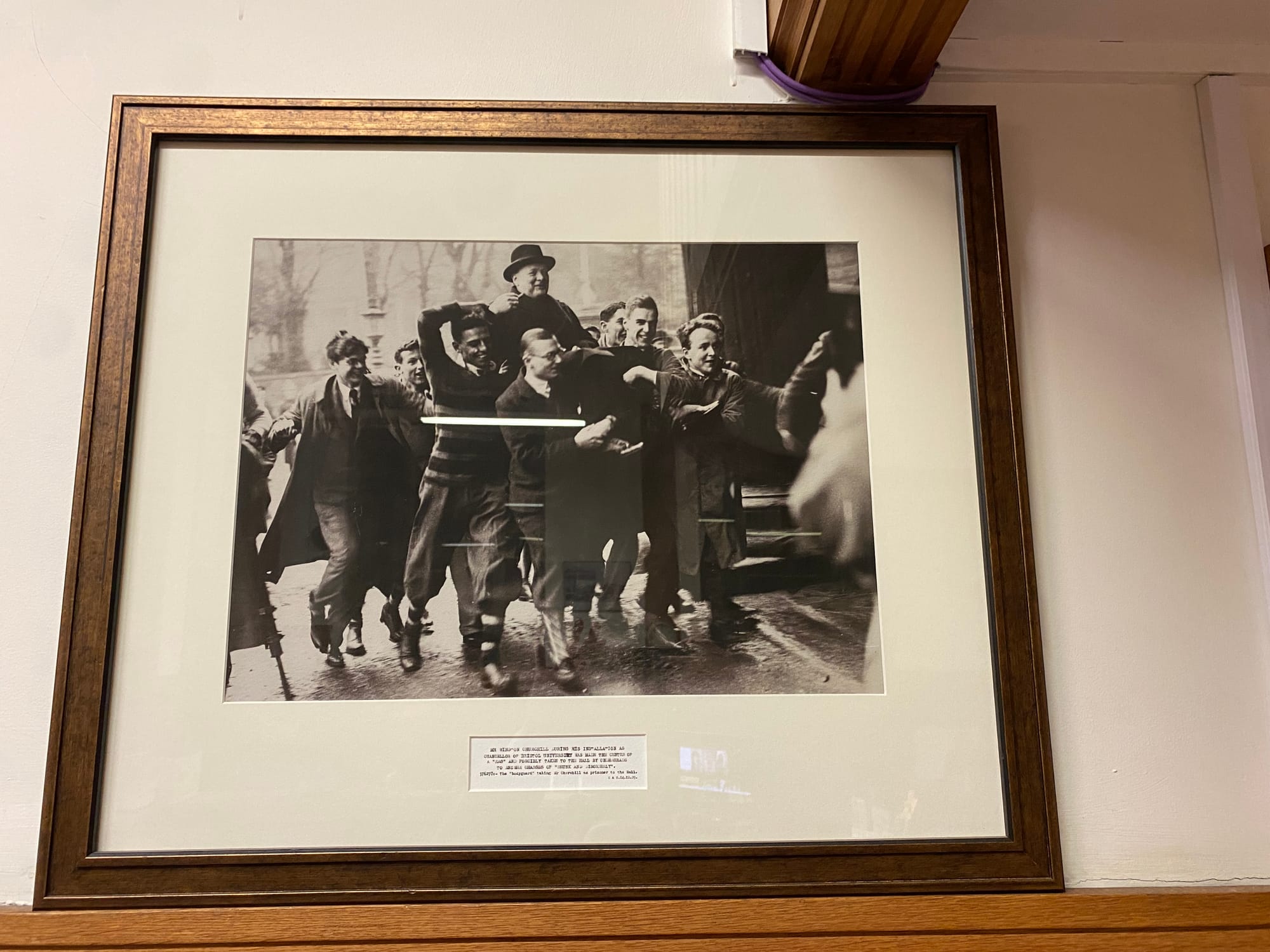 Students who spend time in the Queen’s Building Library may be familiar with some artworks hanging around its interior. A large charcoal drawing depicts the monochromatic view of a bridge over water, named ‘Bridge over the Avon Cut as seen from Brunel Way’, donated by the artist, Elizabeth Timms. The image captures a quiet industrial stretch of Bristol, grounding the Queen’s Building in its wider city landscape. An interesting frame that stands out is a black and white photograph of Winston Churchill in 1929 which depicts a mock arrest of the past Prime Minister by students, taking him to the Victoria Rooms for a mock trial on RAG Day, a student charity fundraising event.