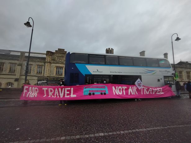 At 2pm yesterday, a group of environmental activists blocked an Airport Flyer leaving for the City Centre from Temple Meads station.