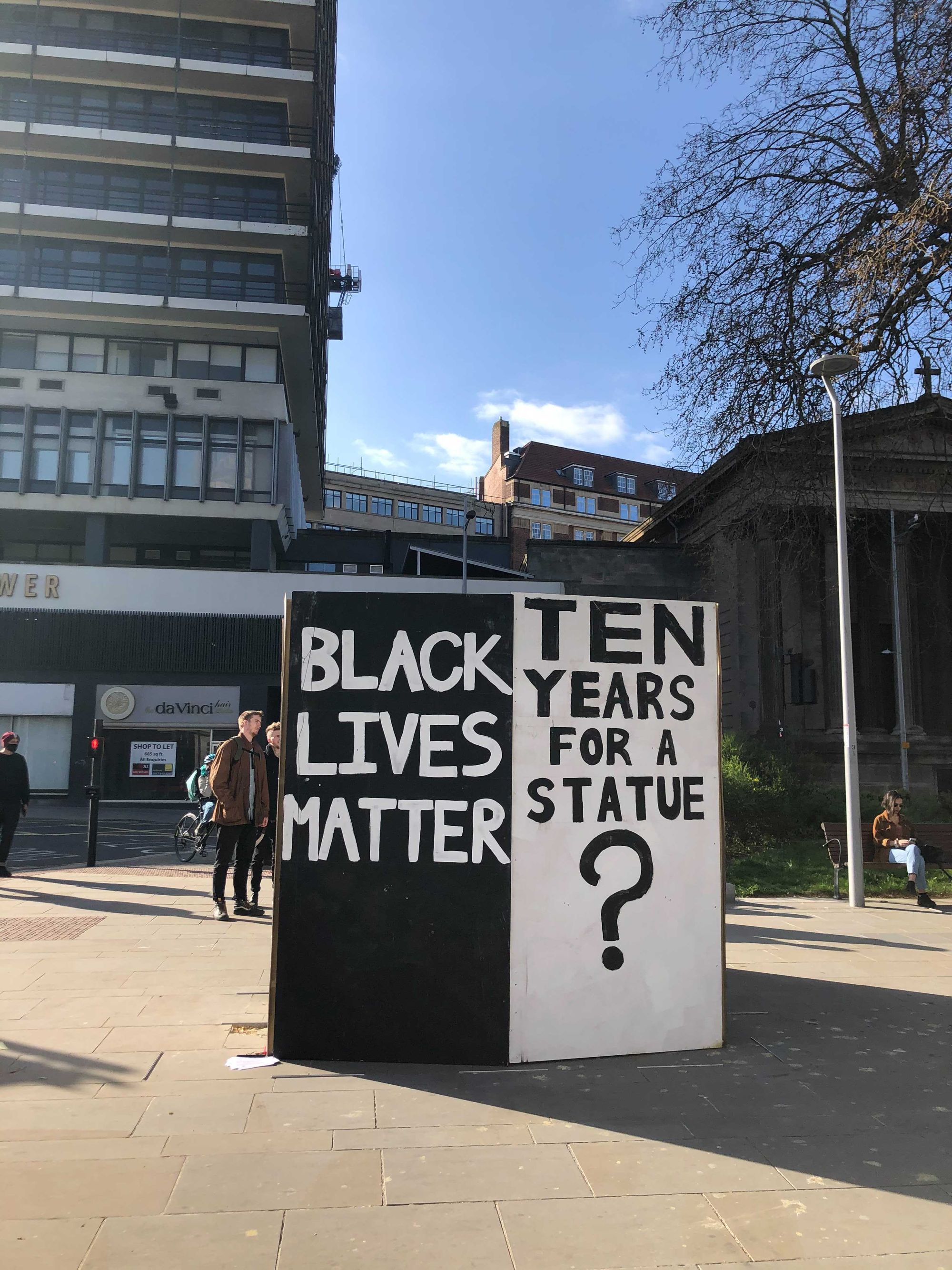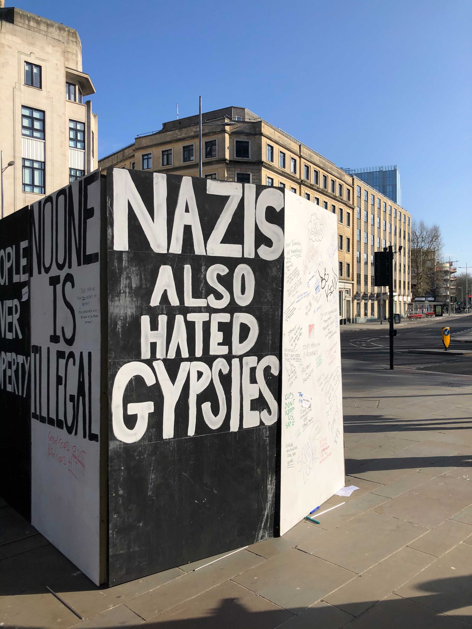 Some protestors have also erected boards around the plinth where the statue of Edward Colston had stood before it was toppled by protestors last summer.