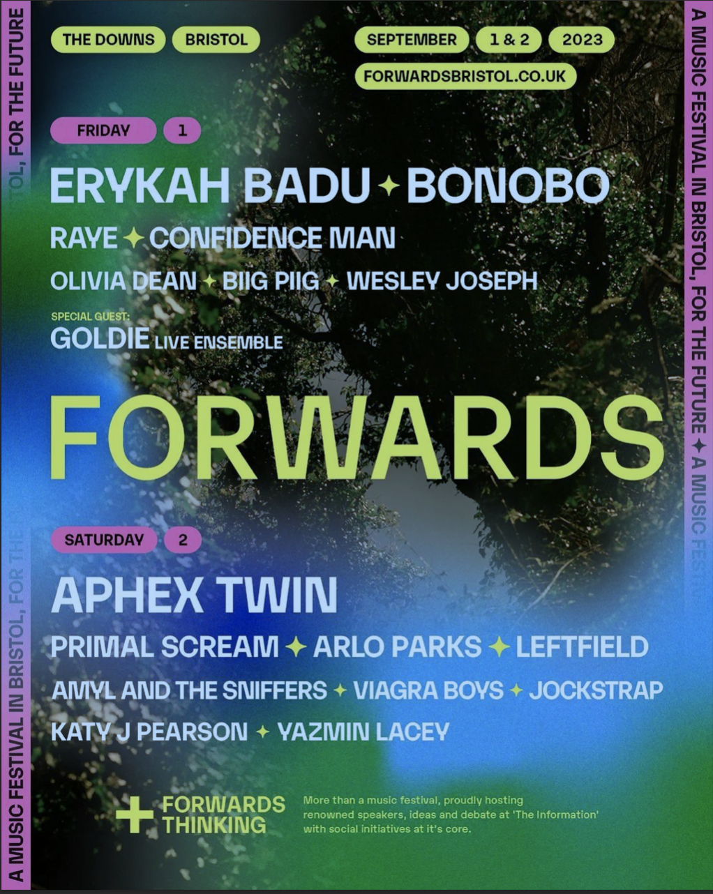 "Building on our work from our inaugural year, we are incredibly excited to be able to pull together a musical offering with such an amazing array of talent. It continues to be our aim to make FORWARDS a space which invites debate and challenges the status quo. Offering our audience a place to come together, dance and make memories, while trying to inspire discussions, actions, and to enact positive change through the urgent conversations at ‘The Information’."