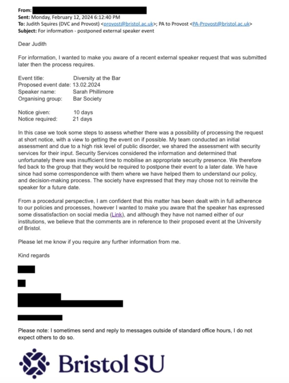 Bristol SU detailed to the Deputy Vice-Chancellor that the Security Services then 'determined that unfortunately there was insufficient time to mobilise an appropriate security presence'. As a result, Bristol SU told the Bar Society that they would have to 'postpone their event to a later date'.