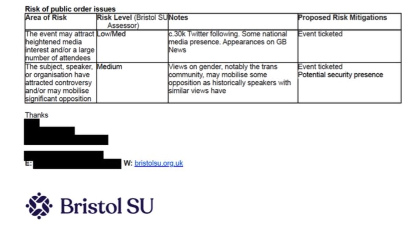 Bristol SU's risk assessment also highlights the precedent that 'historically speakers with similar views' have mobilised opposition. For example, last year a 'Women Talk Back' event sparked a protest due to the trans-exclusionary nature of the organisation.