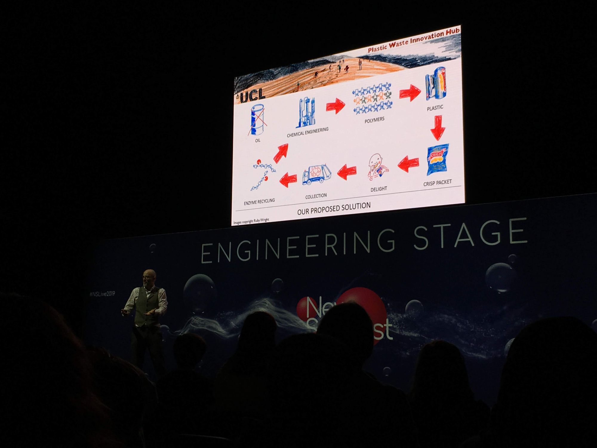 This is obviously not a sustainable solution – but what can we do when our society is, as Miodownik put it, built around waste and disposability? Using the universal appeal of crisps, Miodownik made a very salient point; crisp packets are generally made using three layers of plastic. While effective at keeping crisps crunchy, they are also difficult to recycle. The problem to solve is not the plastic itself, Miodownik argued – it is figuring out how to efficiently recycle it.