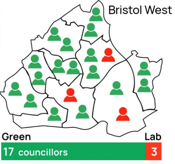 The victory also raises questions about the security of Labour’s Bristol West parliamentary seat, as the Greens now hold 17 of the 20 council seats in the constituency.