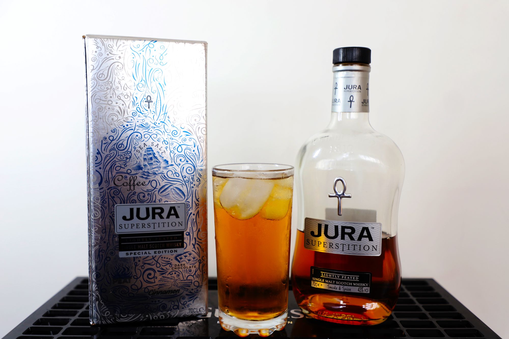 4 shots of Smoky Whisk(e)y - Once again I used Jura Superstition in my original version for its cinnamon kick and heavy smokiness. Any generic bourbon or blended scotch will suffice but for Islay whisky alternatives see the list at the end.