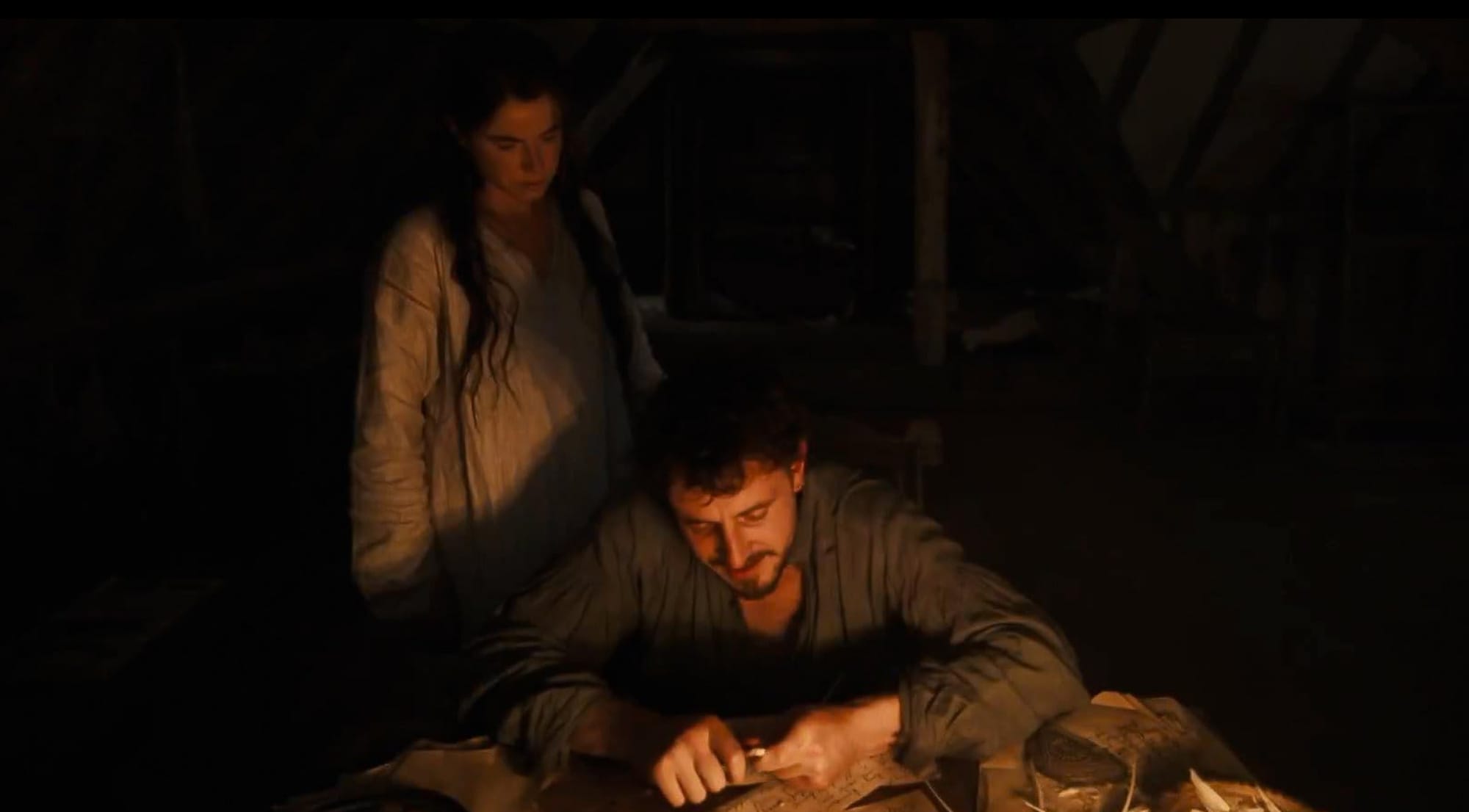 Crucial to understanding Shakespeare’s choices is the influence of his father, John (David Wilmot). His home environment contrasts sharply with Agnes’s world: dark, somber, emotionally barren. John is cold, embittered, and openly disappointed in his son, repeatedly calling him useless and reminding him of debts and failure. Their relationship is marked by violence and shame, culminating in a physical confrontation that leave Shakespeare drunk, angry, and frightened of what he might become. This inherited brutality weighs heavily on him as he admits to Agnes she is scared he will see what he is capable of. The setting reinforces this: dim interiors, heavy shadows, and claustrophobic framing make his family home feel oppressive, in stark opposition to the openness of the forest and Agnes’s light-filled spaces. The film makes it painfully clear that Shakespeare is not simply running towards success, but away from becoming his father.