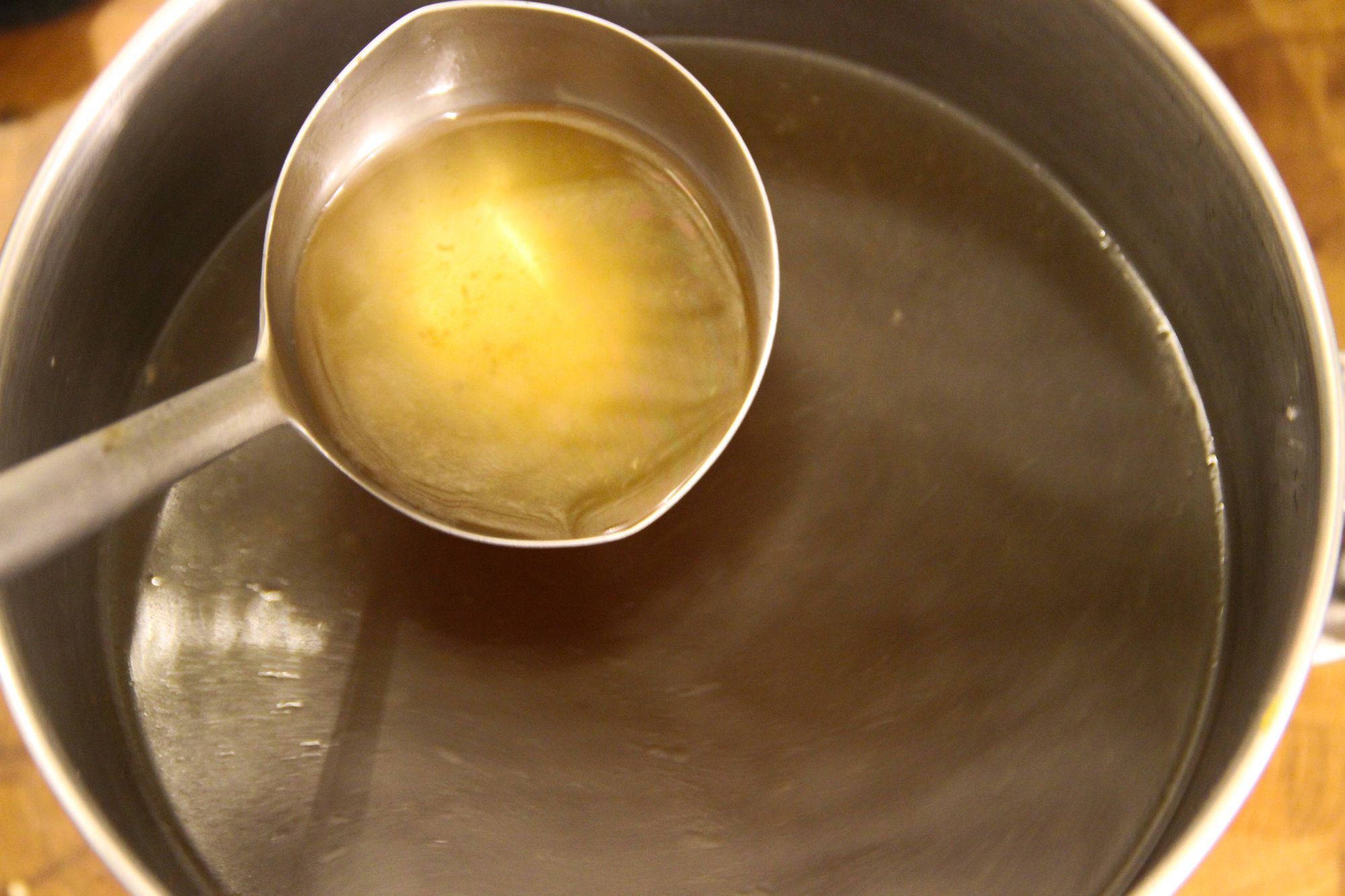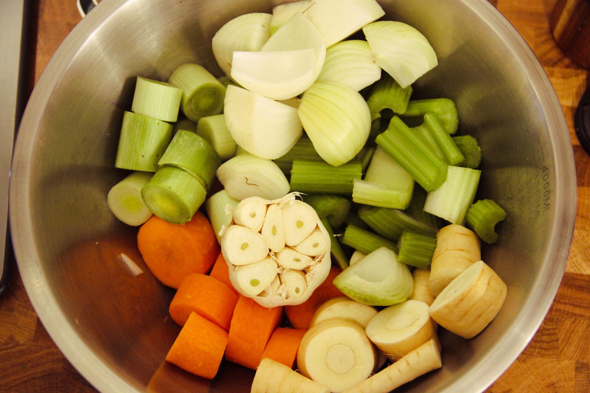 The wings, along with onions, are covered in water and brought to the boil, skimming off the grey bubbles that rise to the surface. Once boiling, parsnip, swede, carrots and seasonings are added to the pot. This is then left to simmer for several hours, after which stock cubes (specifically Telma brand) and tomatoes are added - a less traditional addition, but one that elevates this soup in indescribable ways. This is left to simmer again for a few hours before turning it off the heat and leaving it to sit overnight to allow the flavours to fully develop.