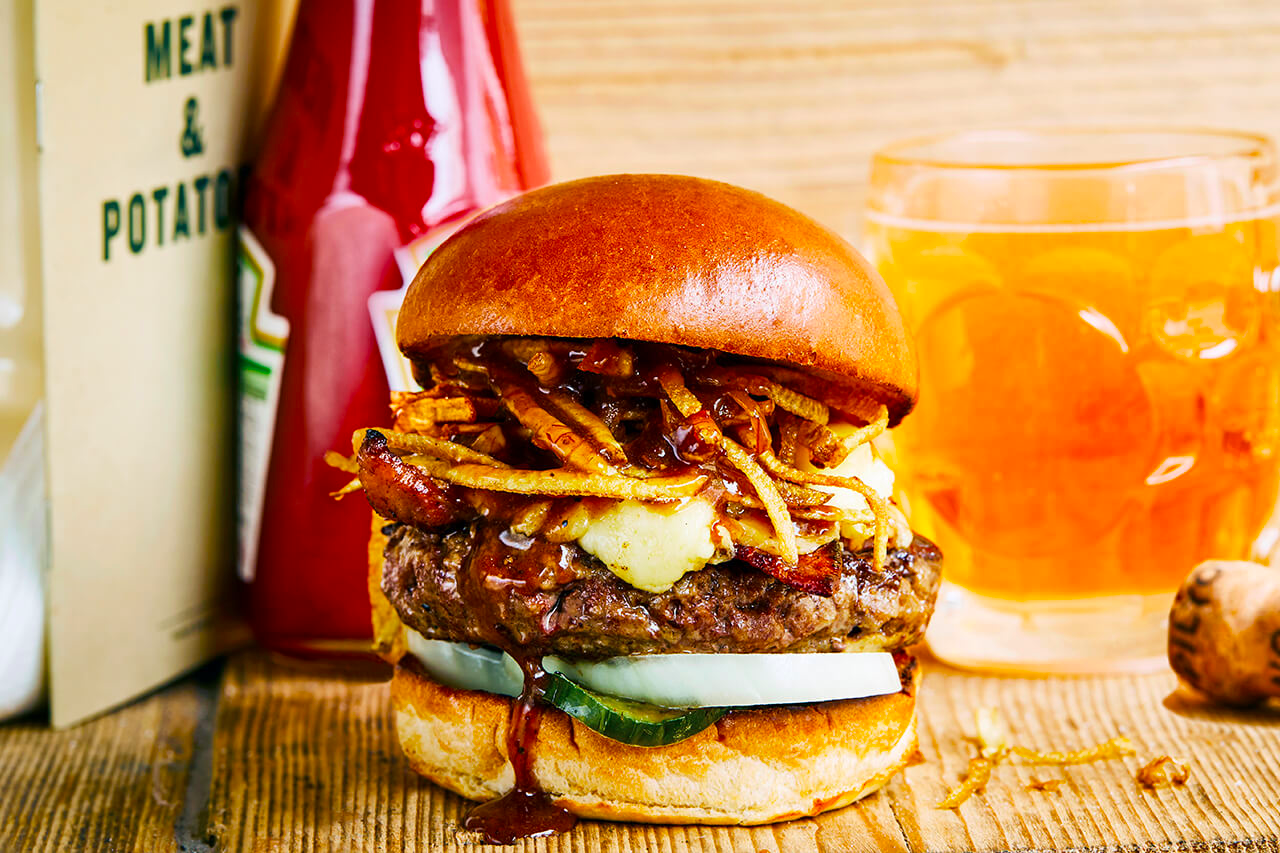 This addition consists of: a beef and bacon burger with smoked cheddar and cheese curds, shoestring fries, cider and bacon gravy, onion and pickles.