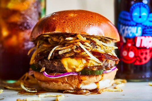 This burger is the child of the Karma Cola collaboration. It consists of: beef, Karma Cola candied bacon, double American cheese, shoestring fries, Karma Cola bacon gravy, red onion and pickles.