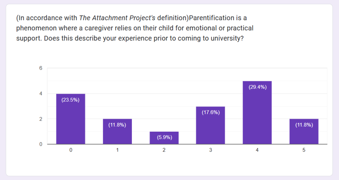 I posted a survey on my Instagram asking whether students at the University of Bristol felt that being parentified affected their ability to engage with student life. Using The Attachment Theory’s definition, on a scale from zero (they didn’t feel parentified at all) to five (supporting others felt like their main responsibility growing up), around 60 per cent placed themselves between three and five on the ‘parentification’ scale, which I’ve identified as heavily parentified. Some of those who were heavily parentified corroborated how I felt, reporting how a past of protecting others led to being the one that kicks off at pervs in the club or looks after the stumbly one on the way home. Similarly to my own experience, several mentioned how the practice of prioritising others led to a neglect of themselves.