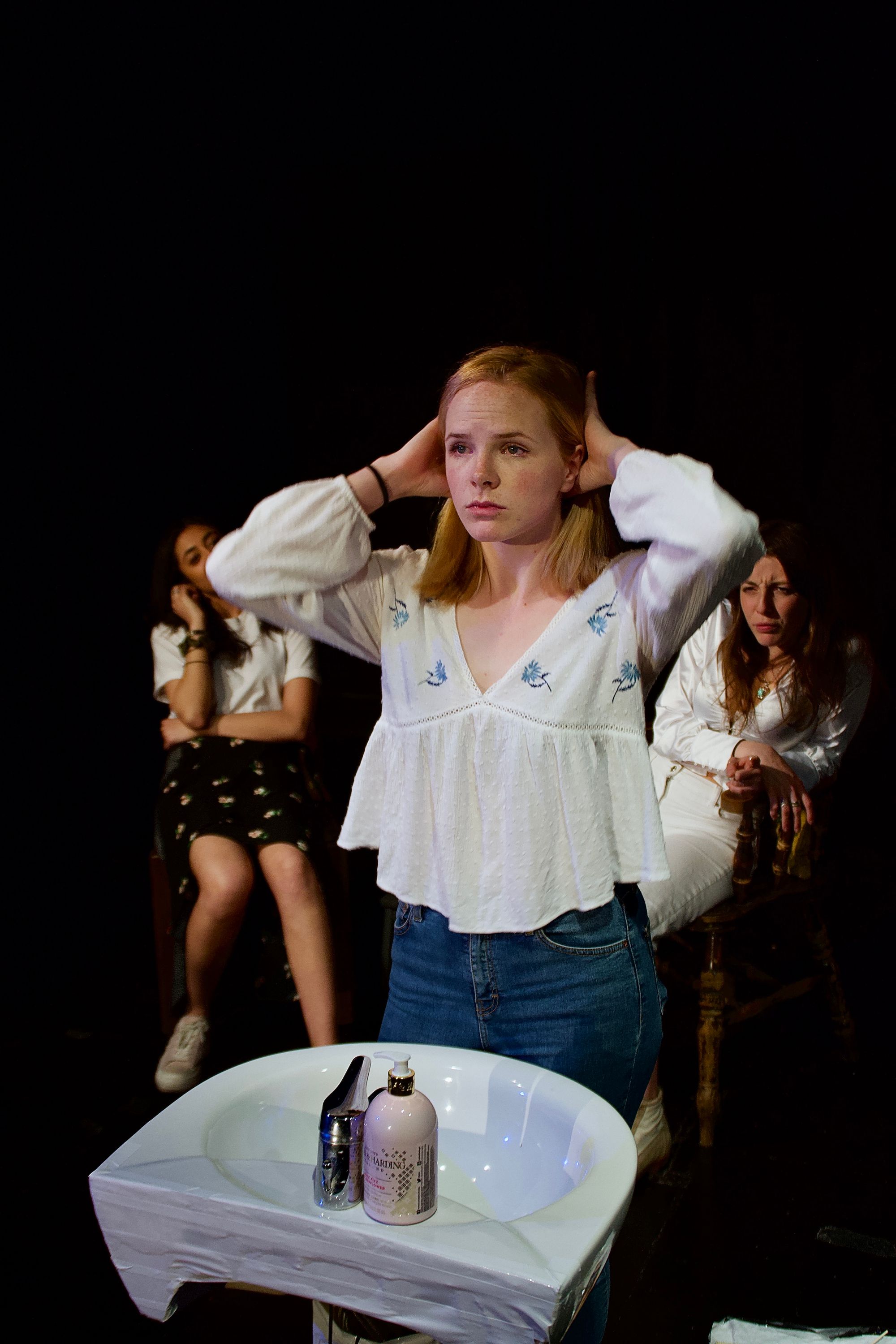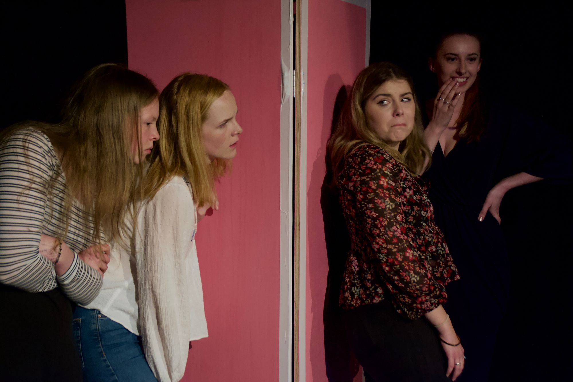 With regards to design, Polly Wain’s minimalistic but effective set situates us comfortably in a ladies’ toilet, complete with saccharine-sweet pinks, slightly naff wicker decor and Charlie body mist. The on-stage toilet cubicle provides seemingly endless dramatic possibilities, most notably acting as an inconveniently non-soundproofed drunken confession booth in the final moments. The sound and lighting design are both minimal but work well in their contexts. Hot Flush excels as a dry comedy with complex inter-character relationships; to weigh it down with unnecessary SFX would be to take away from some of its charm.
