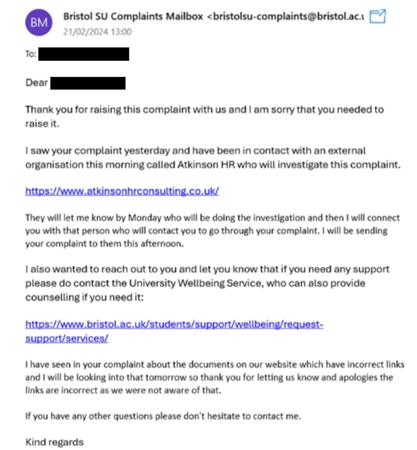 Despite the email’s promise, Louise said she did not receive a follow up of who was investigating her complaint. After updating and re-submitting her complaint, the SU eventually provided an update on 1 March.