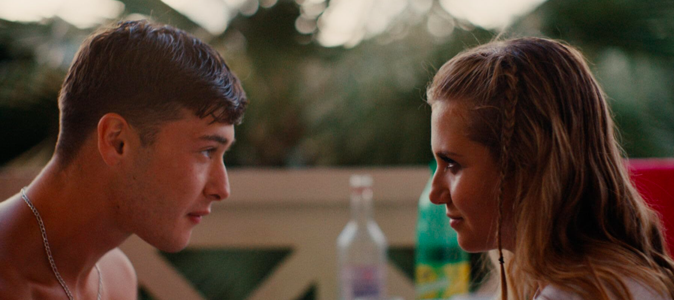 With an air of inevitable chaos, the three girls stay in a flat opposite another party group, Badger, Paddy and Paige. Tara develops as the lead in the film as she meets the scruffy, bleach-blond-haired Badger with whom chemistry is instant. Paddy is introduced as the ‘well jokes’ mate of Badger, and Paige develops as Em’s Malia fling, a small but underdeveloped representation of the queer community within the film.