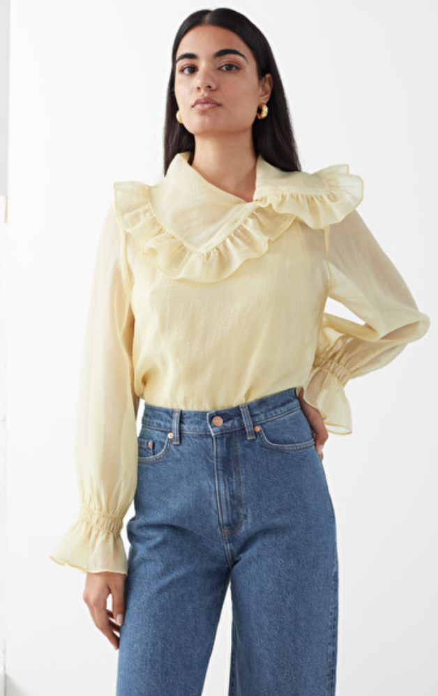 This beautifully frilly shirt could ruffle up the glorious summer atmosphere. The Peter-pan collar would go down well with equally fashion-loving friends.