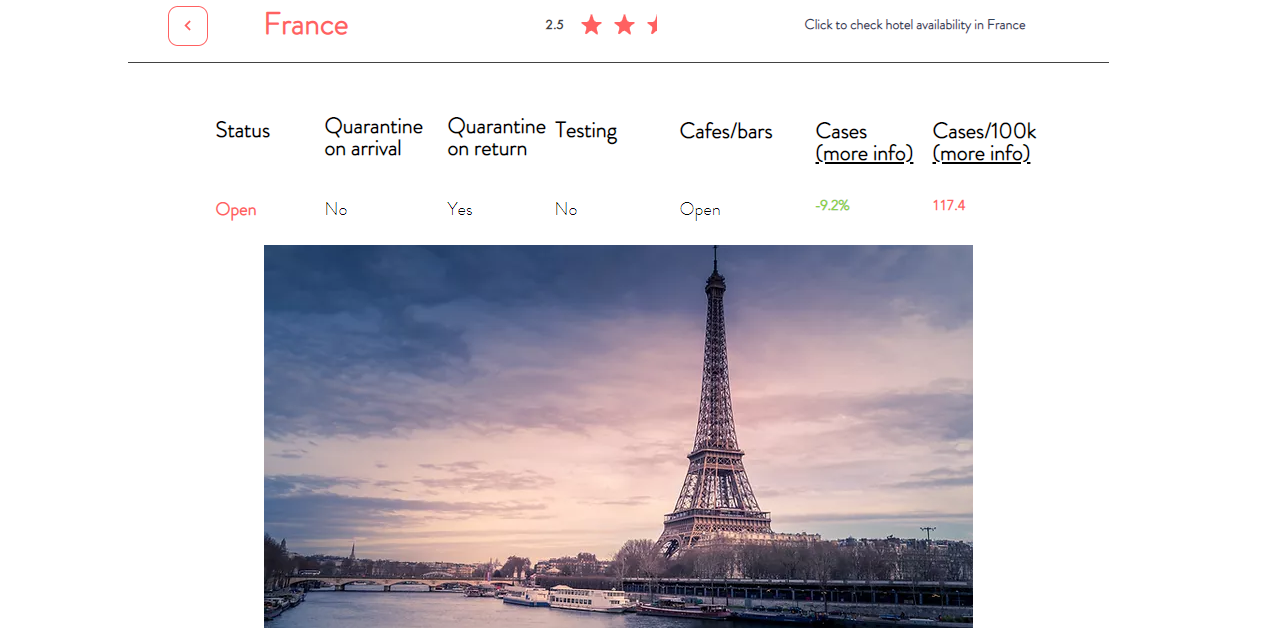 Searching for your desired destination on the website will tell you whether or not the country is ‘open’ to visitors, quarantining and testing requirements, whether cafes and bars are currently open and the country’s rates of infection.