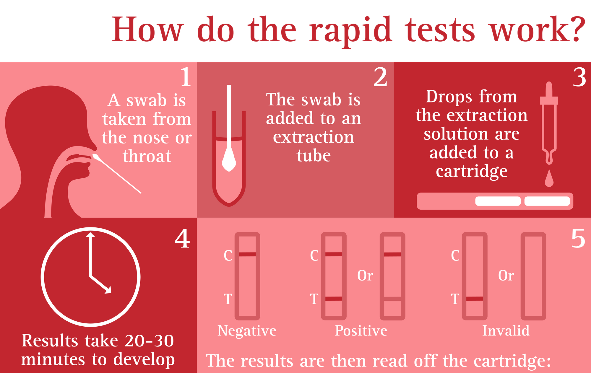 Like PCR tests, LFTs are self-administered via a swab in the nose and throat that will then be placed into an extraction tube. However, these will be processed on-site by testing staff rather than be sent off to labs.